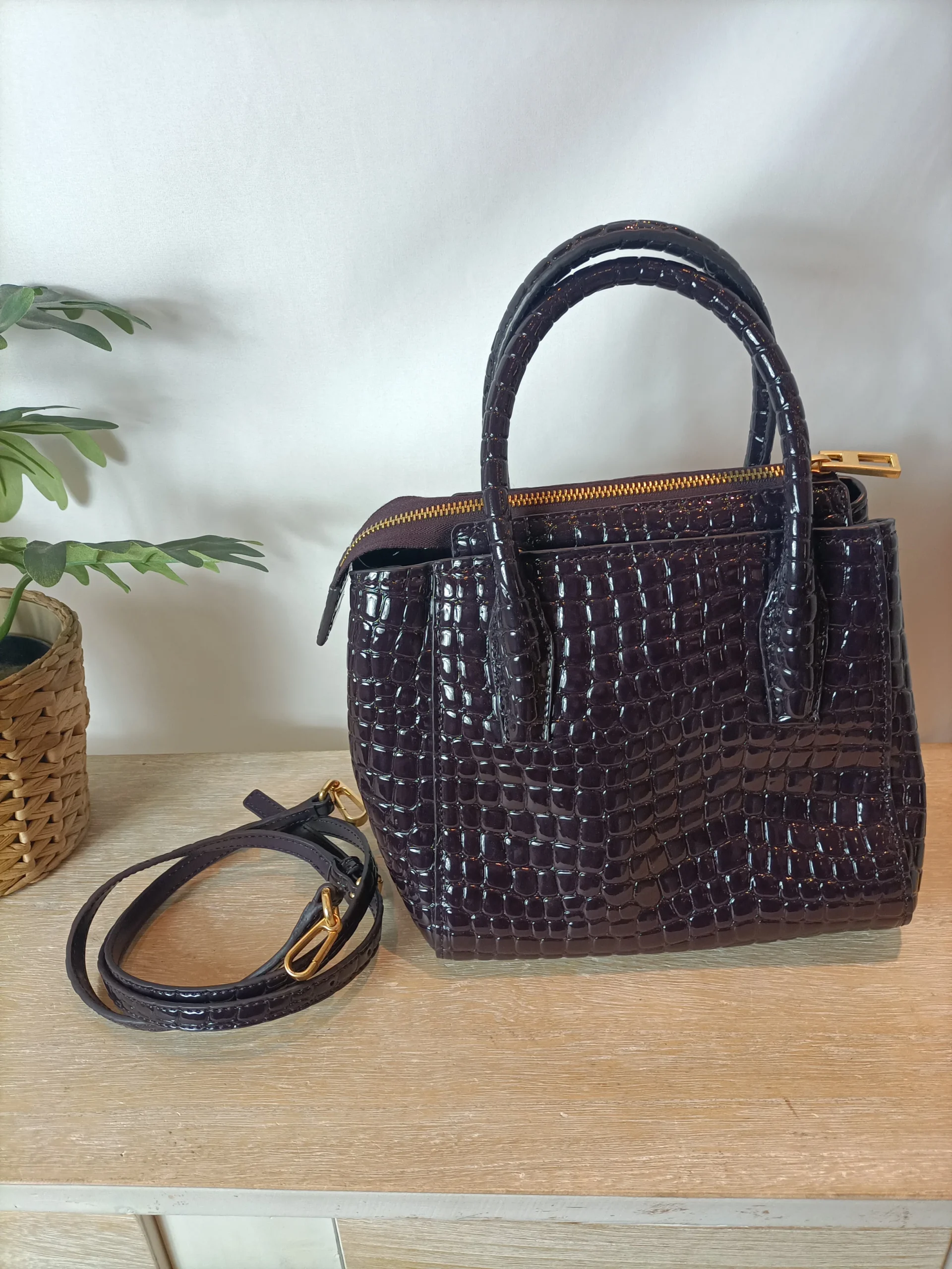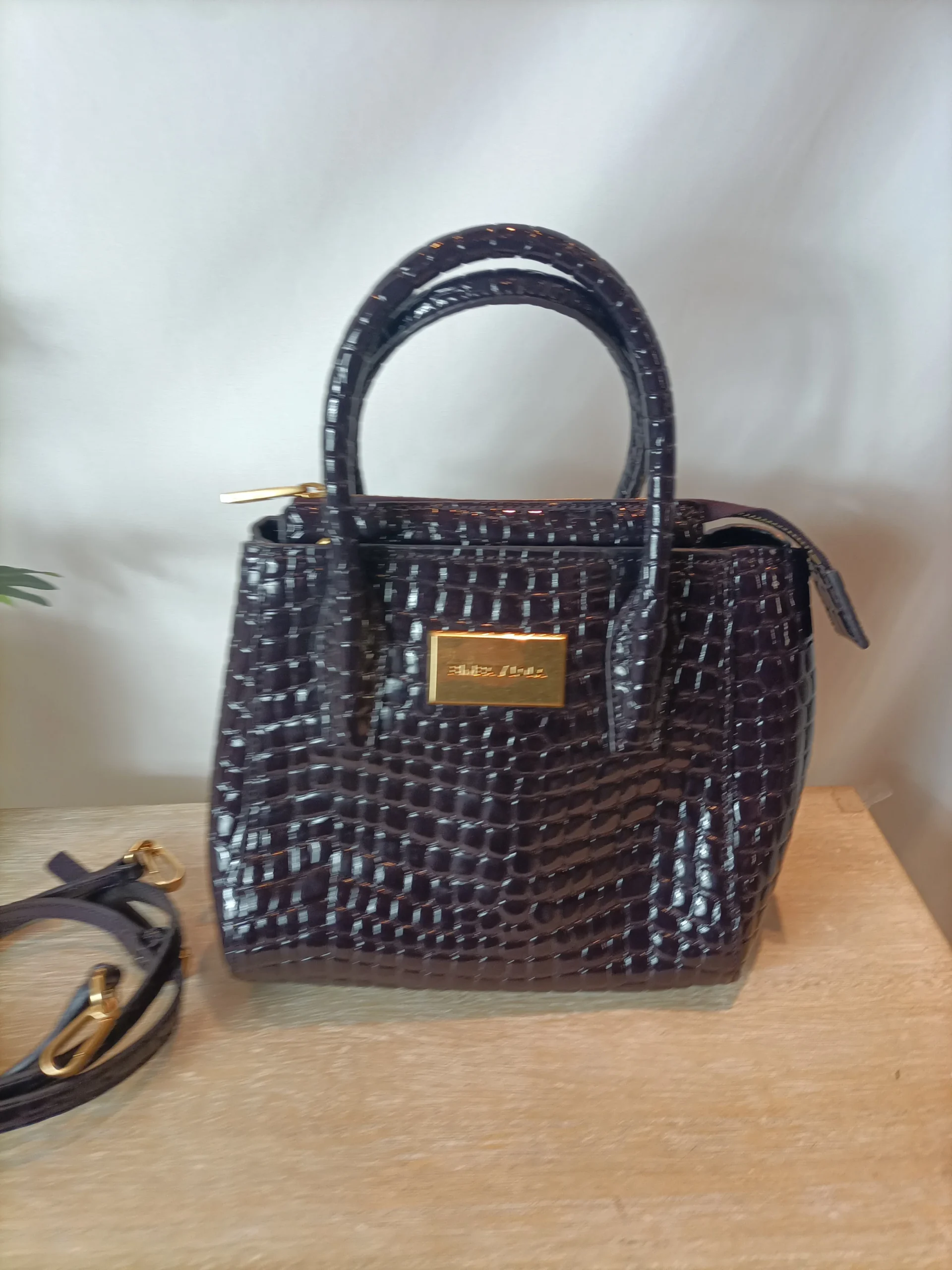Bolso 100% piel color berenjena oscuro con cadena y letras logo en dorado