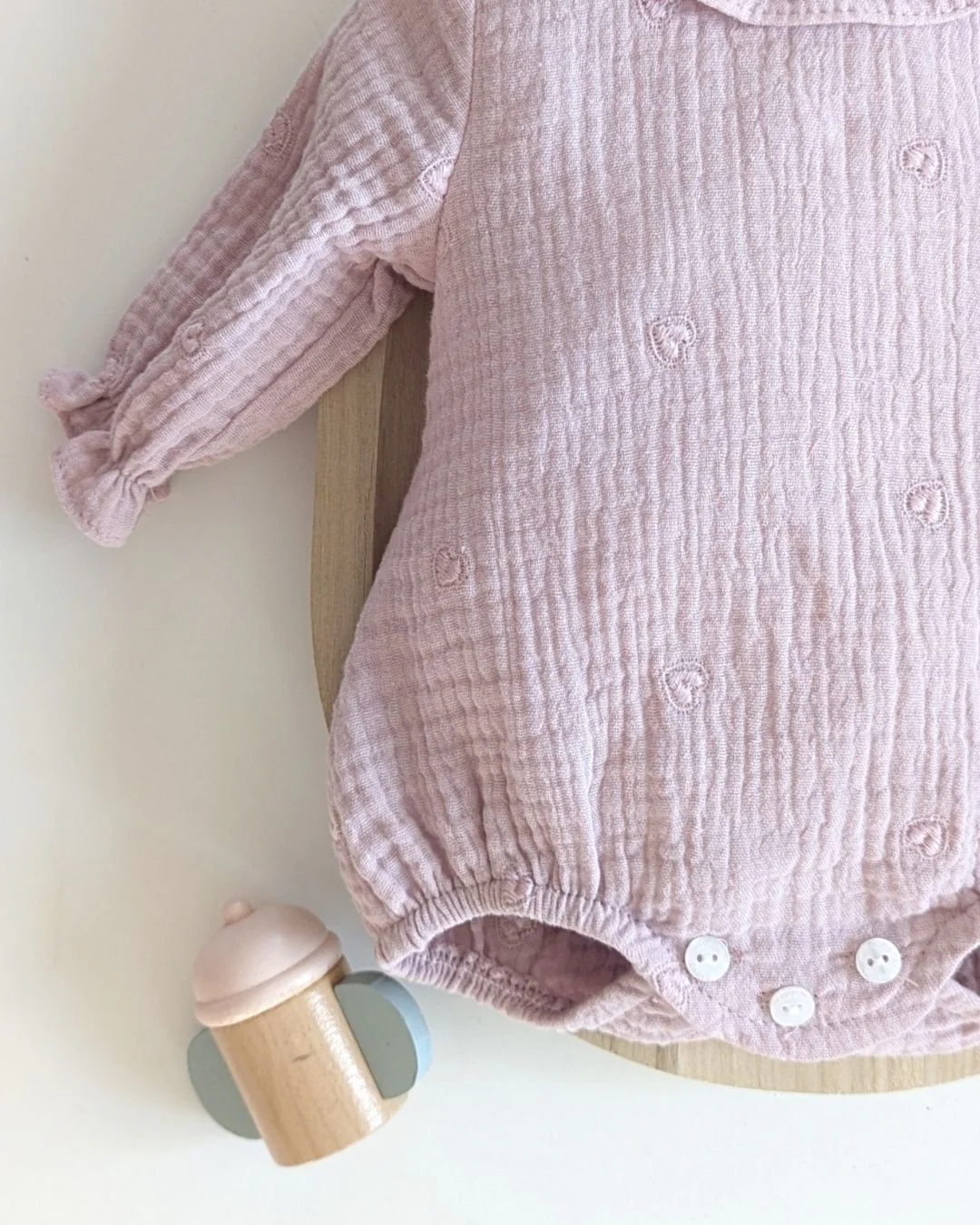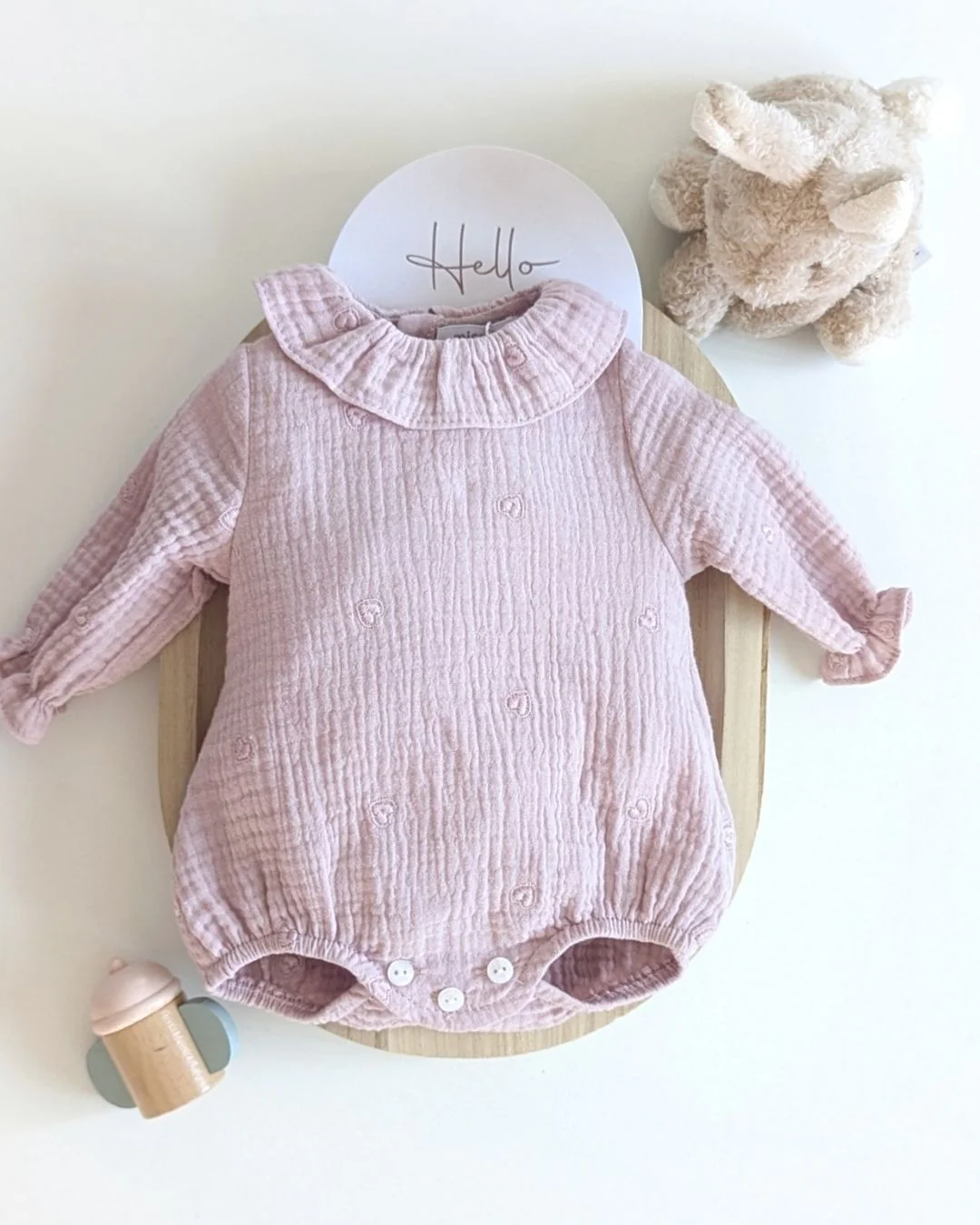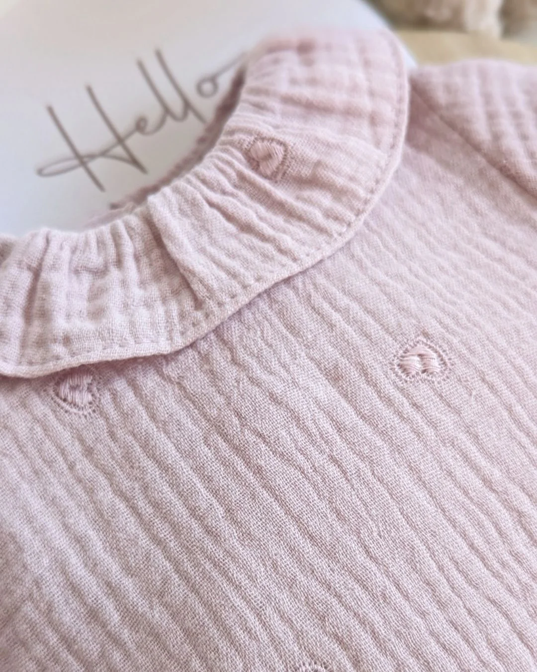 Body de manga larga confeccionado en muselina rosa empolvado con pequeños bordados en relieve, cuello de volante fruncido a tono y detalle de lacitos en los puños. Cierre trasero con botones y automáticos en la entrepierna para un cambio cómodo y rápido.