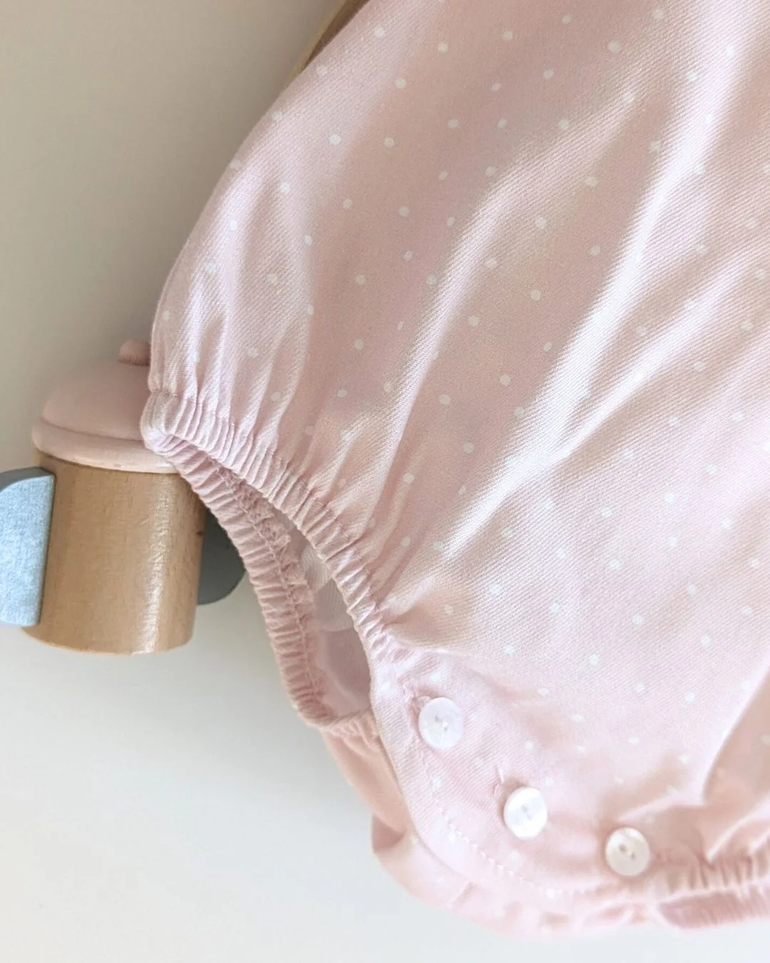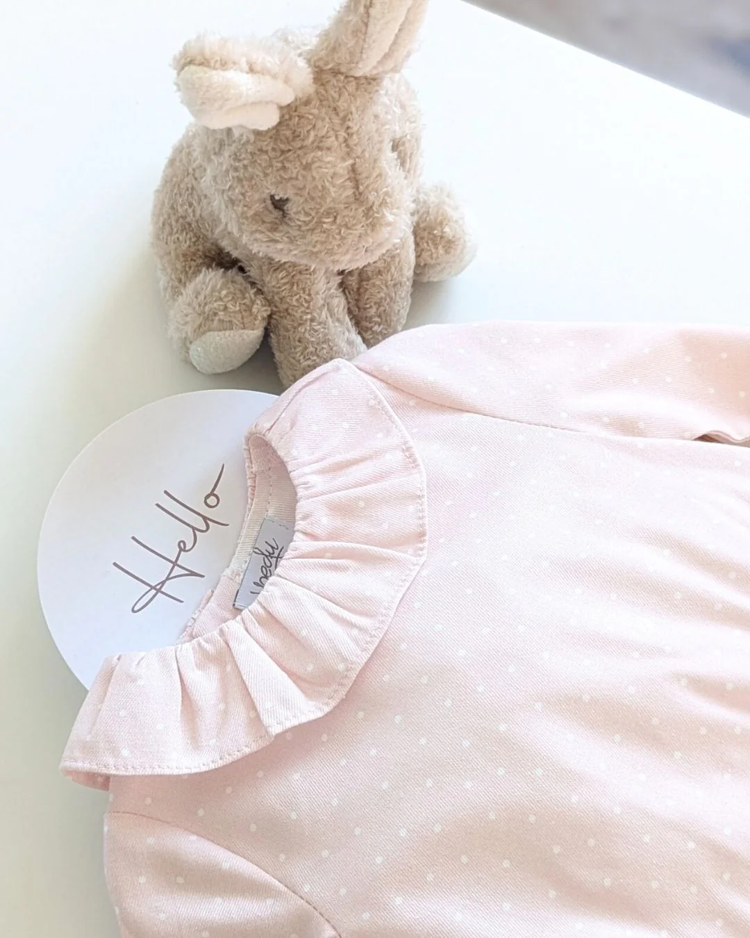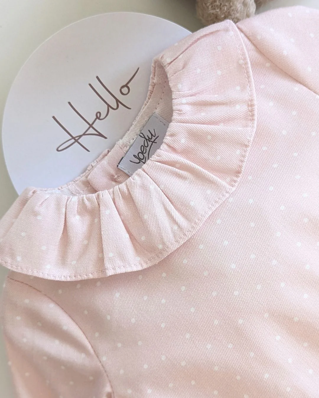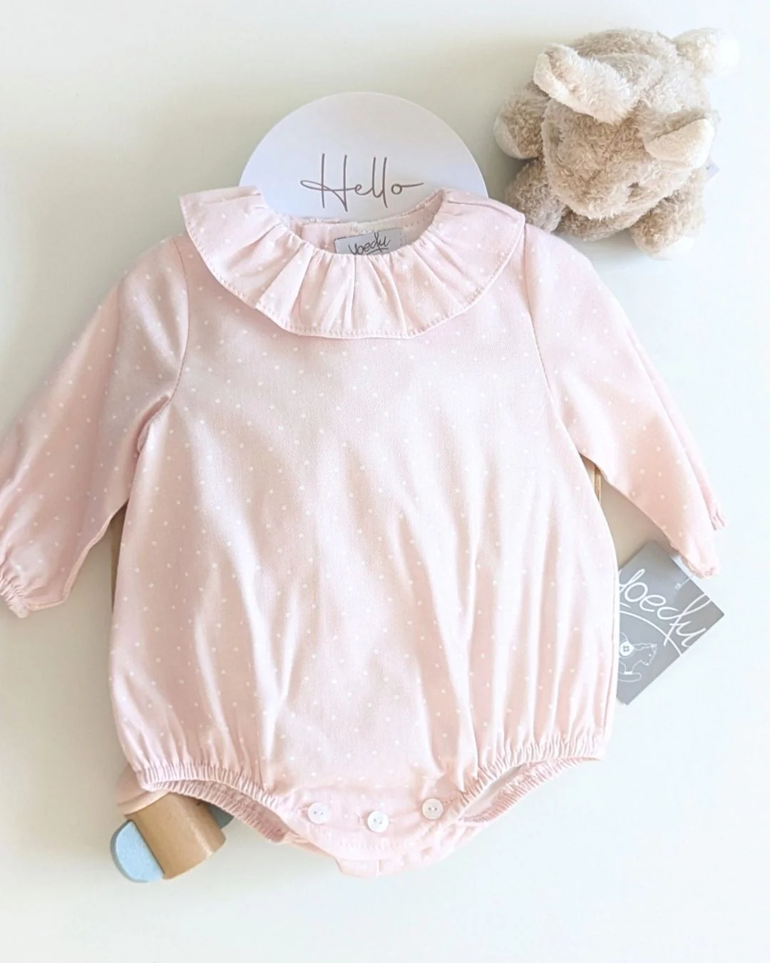 Un body tipo pelele que enamora por su sencillez y dulzura. Este modelo en rosa empolvado con pequeños topos blancos es perfecto para el día a día de tu bebé, combinando comodidad y estilo. Con un delicado cuello volante, mangas largas y tejido suave, es ideal tanto para entretiempo como para llevar debajo de jerséis, petos o ranitas en invierno. Forma parte de la Nueva colección Otoño Invierno 2025 2026 de Yoedu, ya disponible para comprar online en 👉 www.tiendagrumetes.es