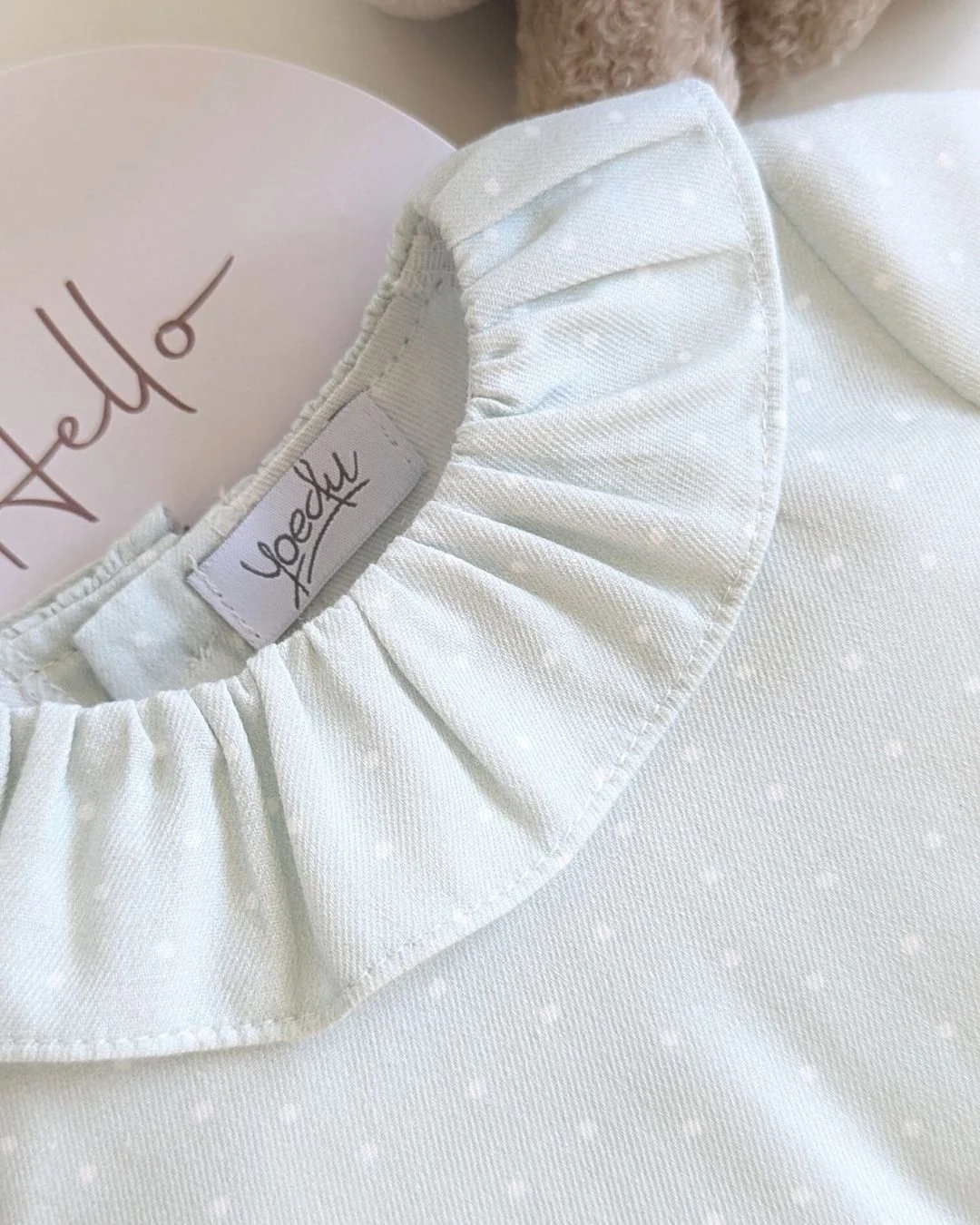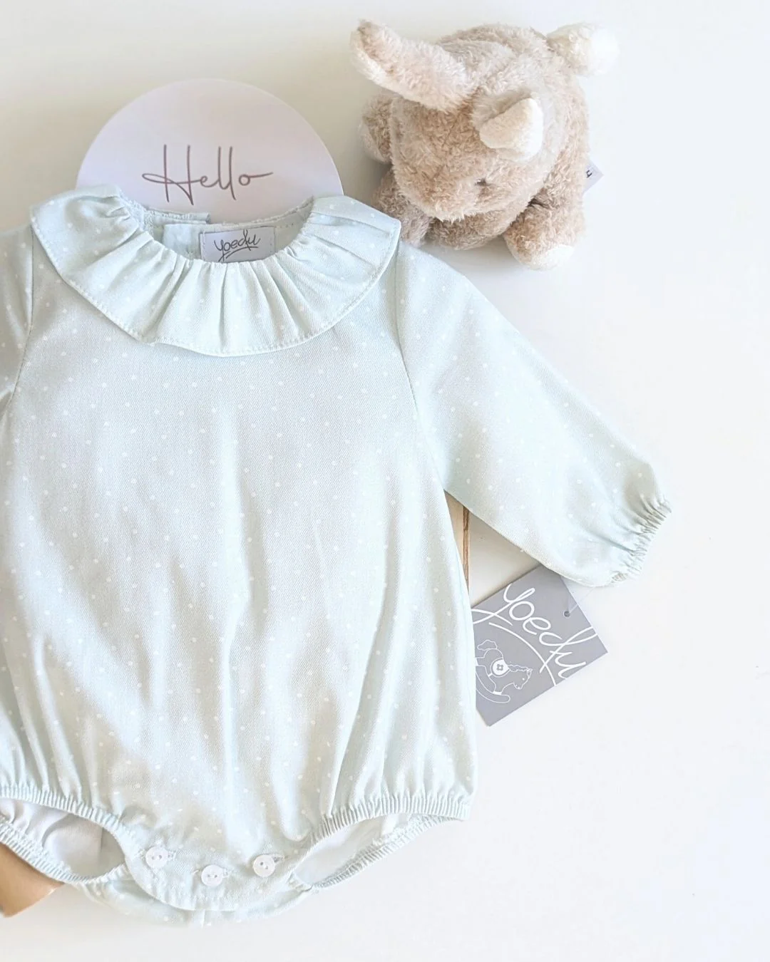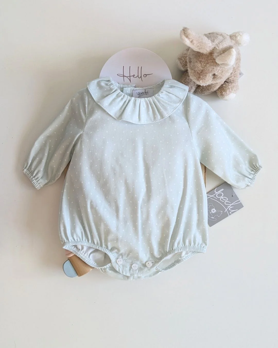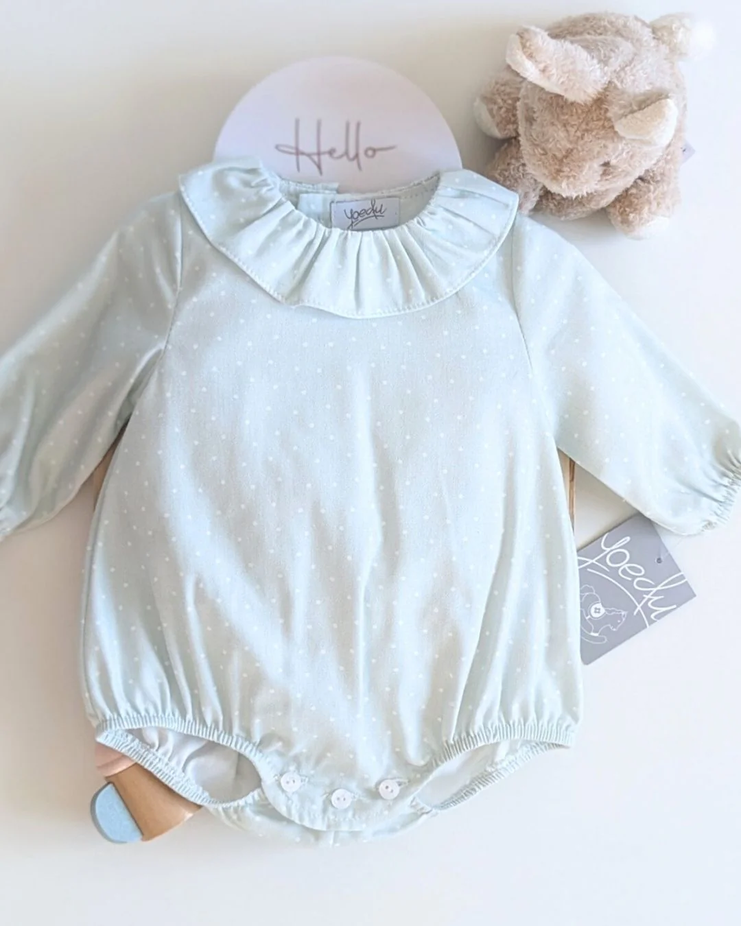 Este precioso body tipo pelele en verde seda con delicados topos blancos es una opción ideal para los looks más dulces de tu bebé esta temporada. Confeccionado con mimo, cuenta con un encantador cuello volante y un diseño suave al tacto. Forma parte de la Nueva colección Otoño Invierno 2025 2026 de Yoedu, pensada para acompañar cada momento con ternura y estilo. Disponible para comprar online en 👉 www.tiendagrumetes.es