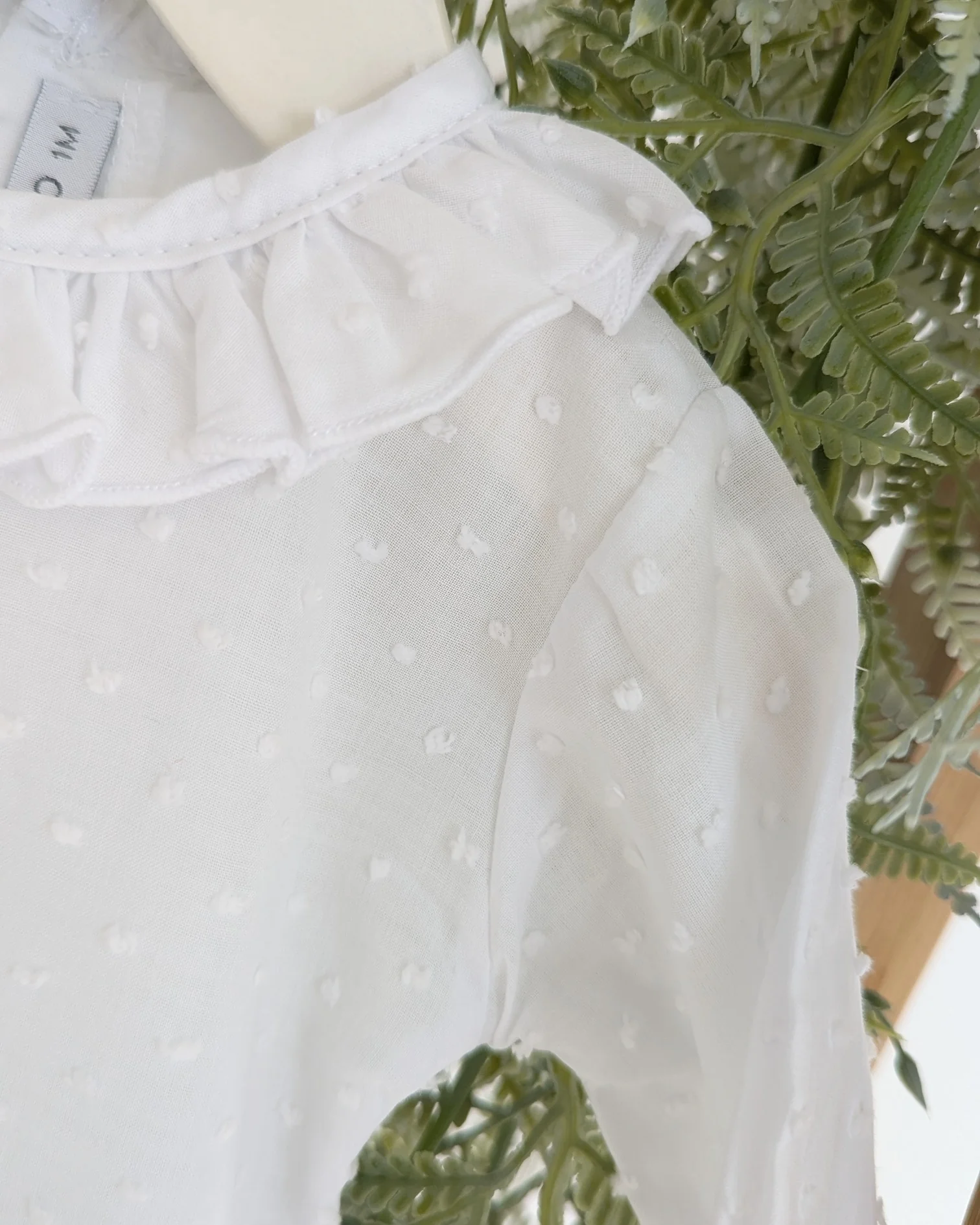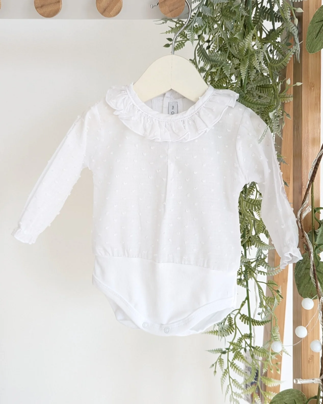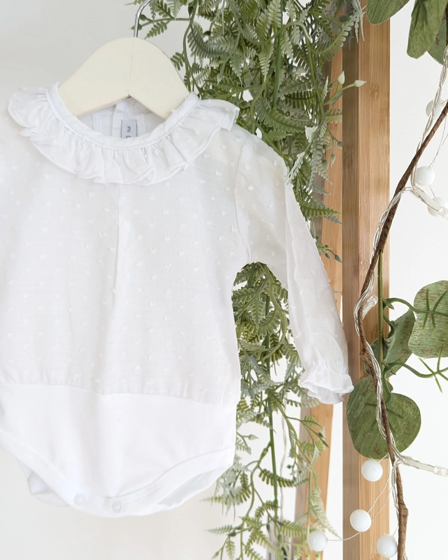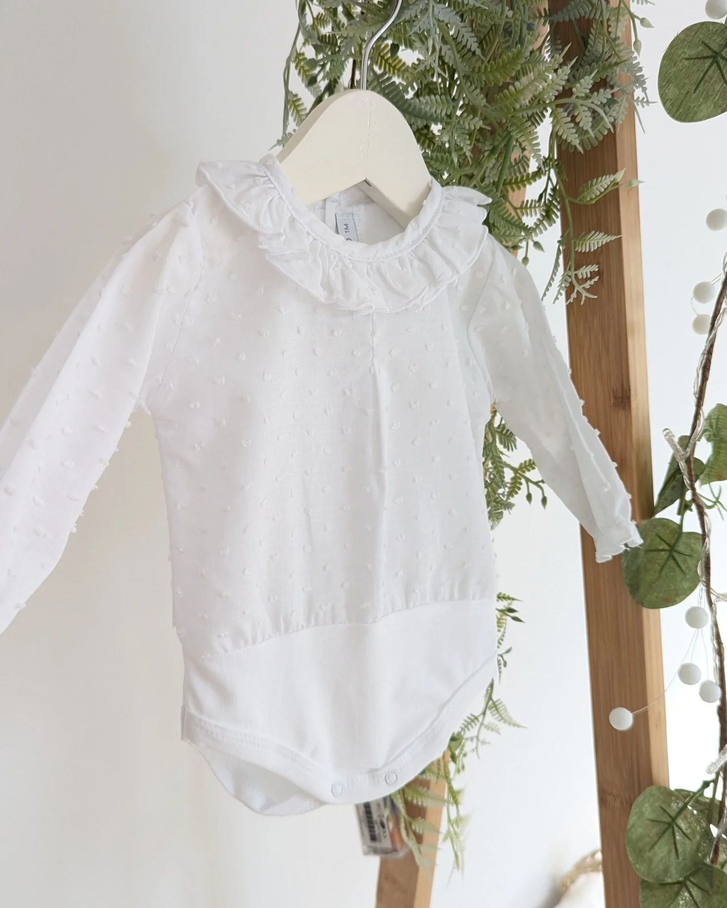 Compra online body para bebé camisa de plumeti de Calamaro Baby con cuello de volante en www.tiendagrumetes.es
