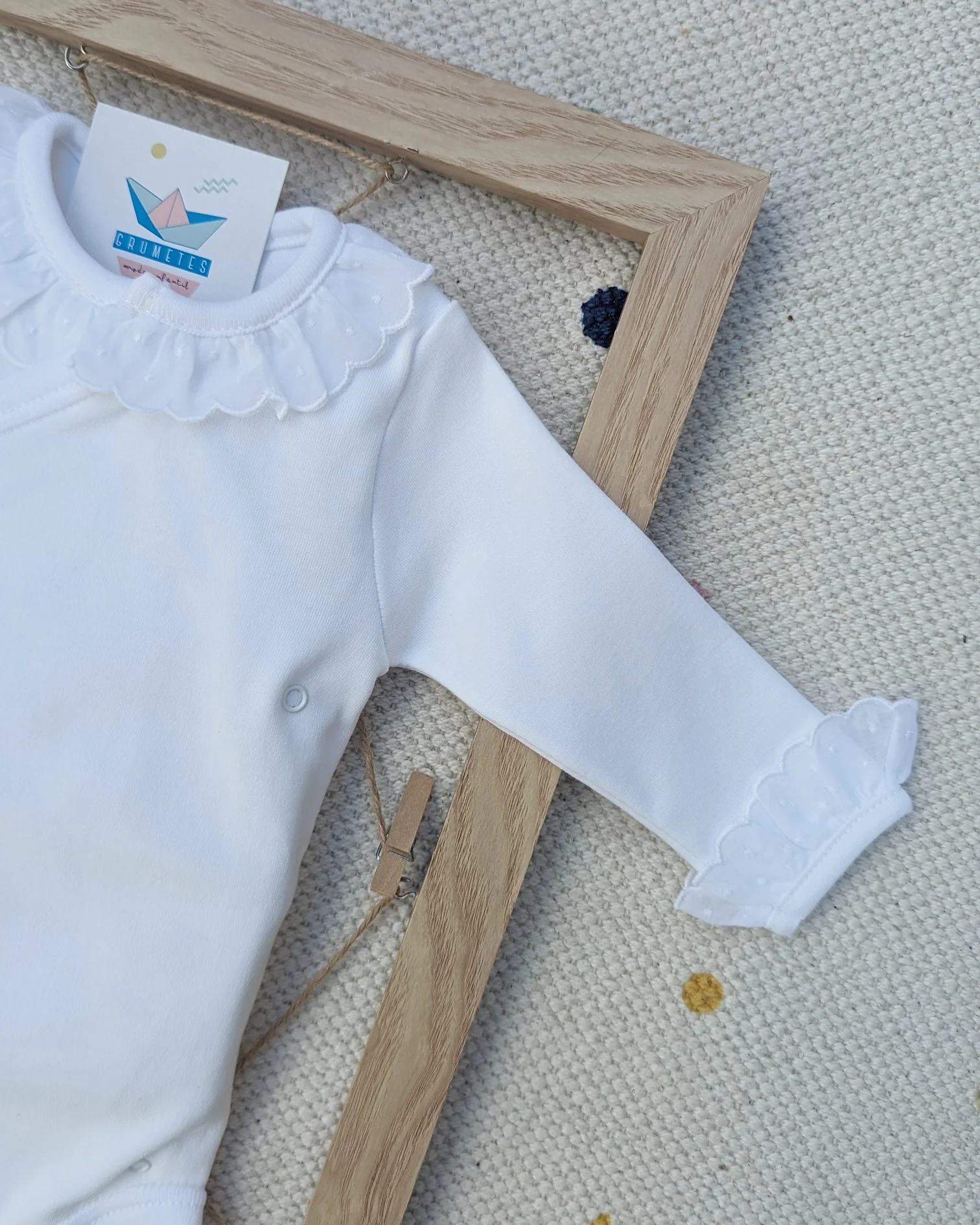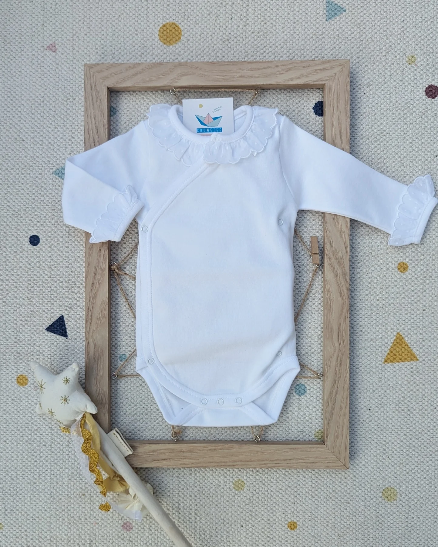 Precioso body con cuello en batista color blanco con abertura delantera para facilitar los cambios de ropa a tu bebé.