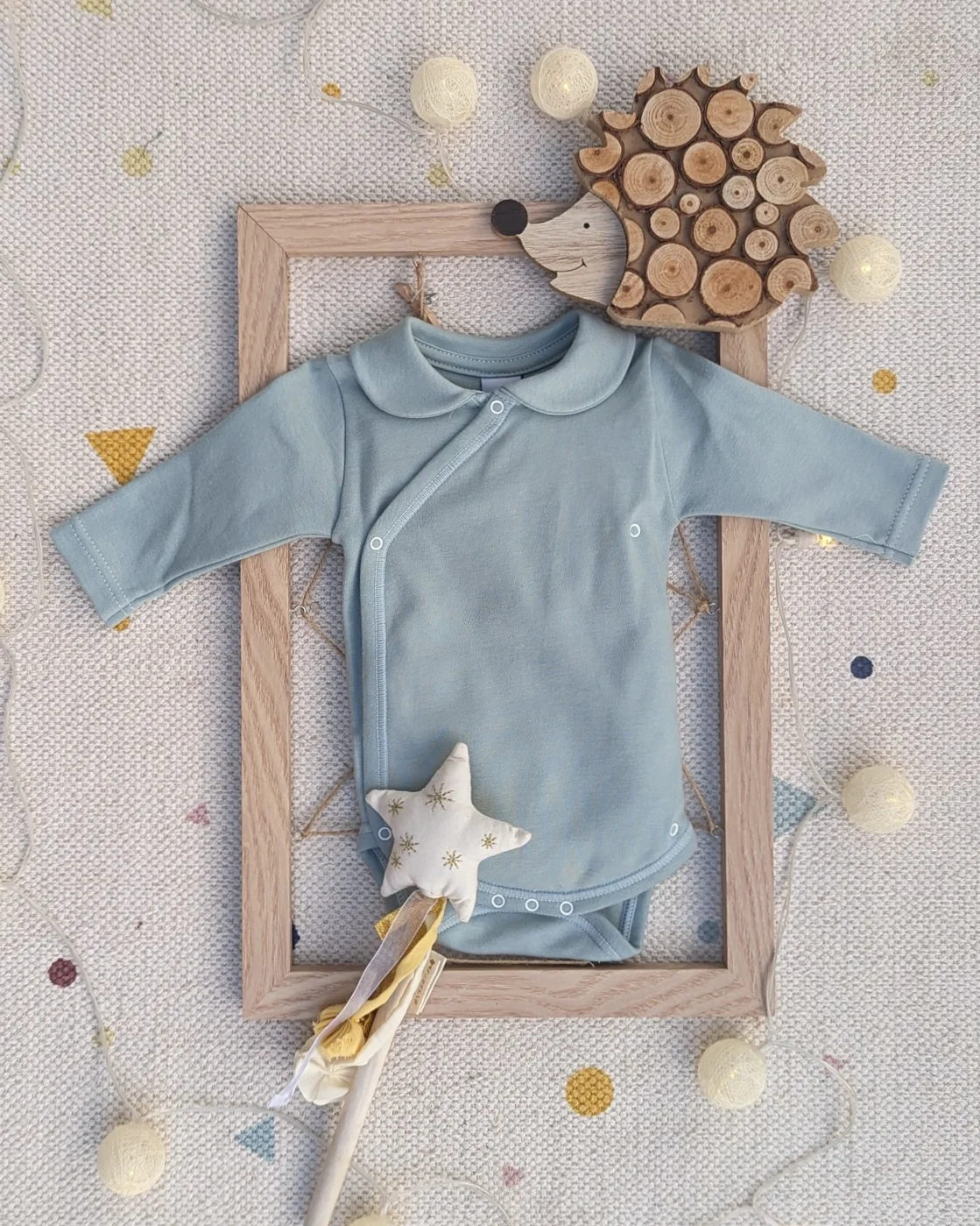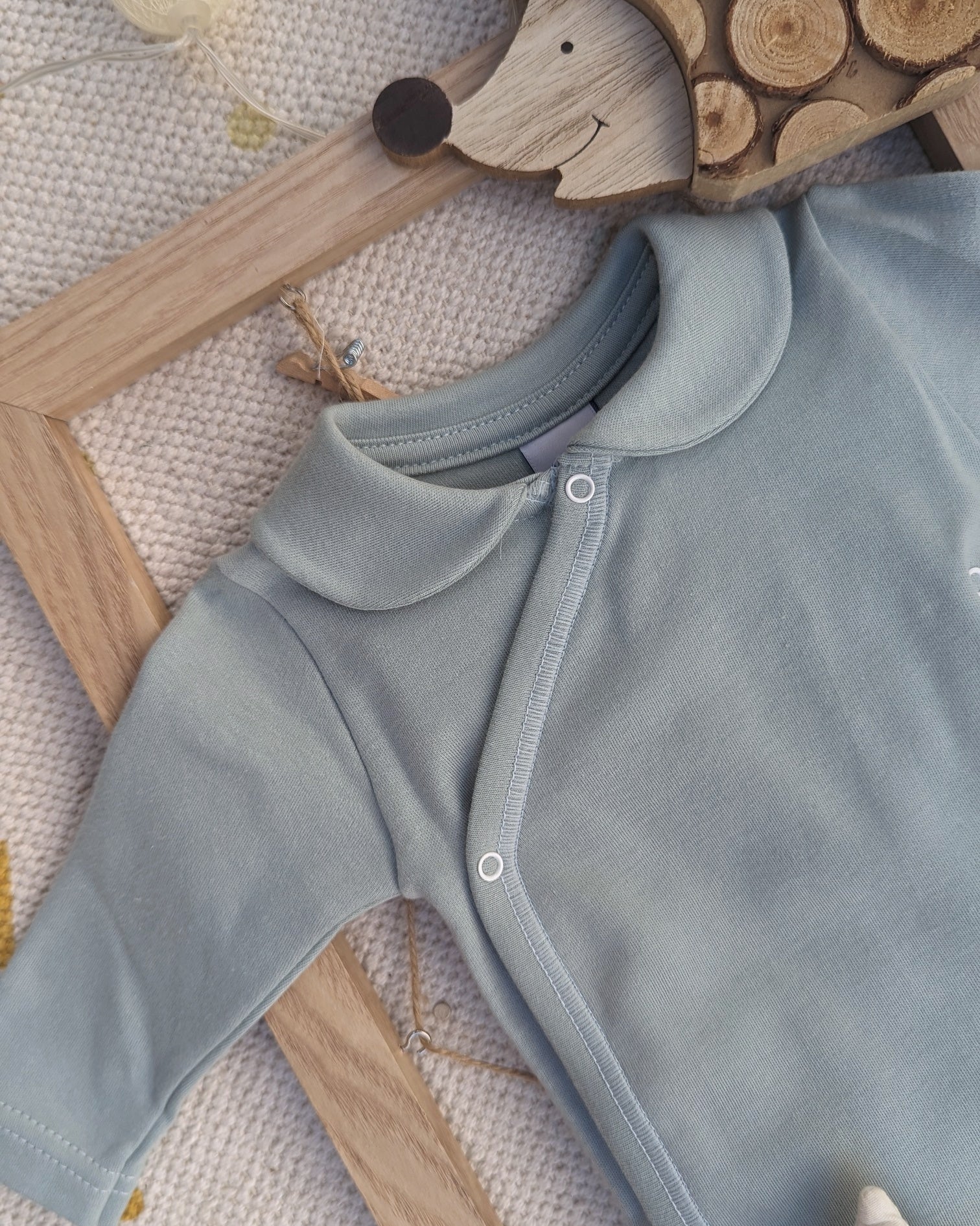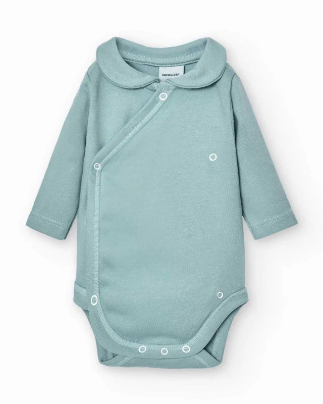 Precioso body con cuello bebé color verde claro con abertura delantera para facilitar los cambios de ropa a tu bebé.