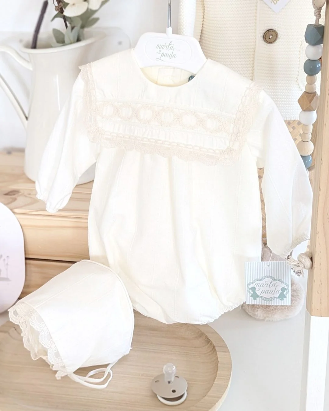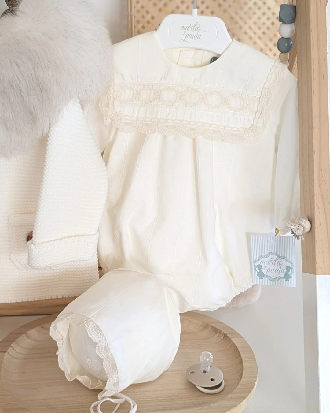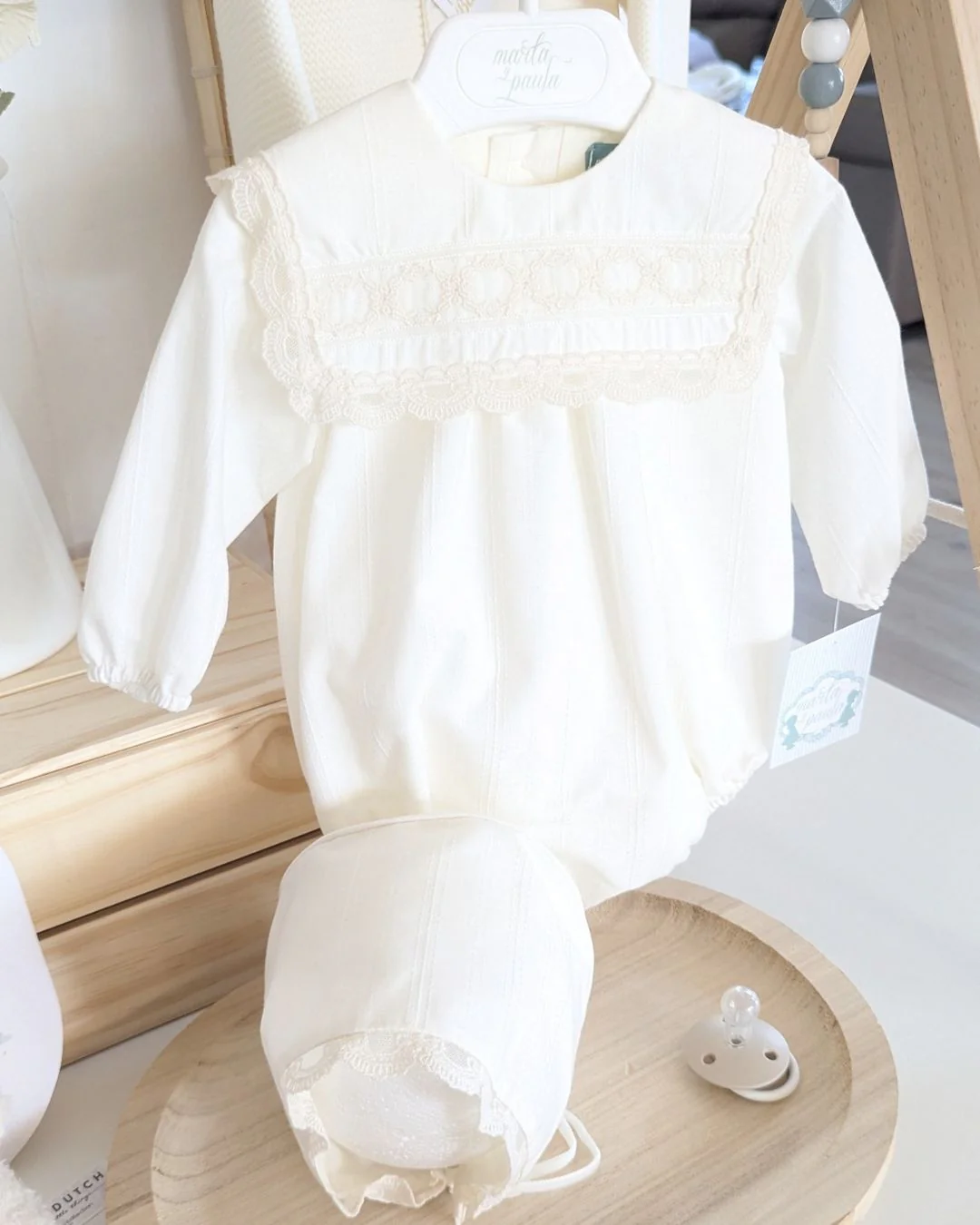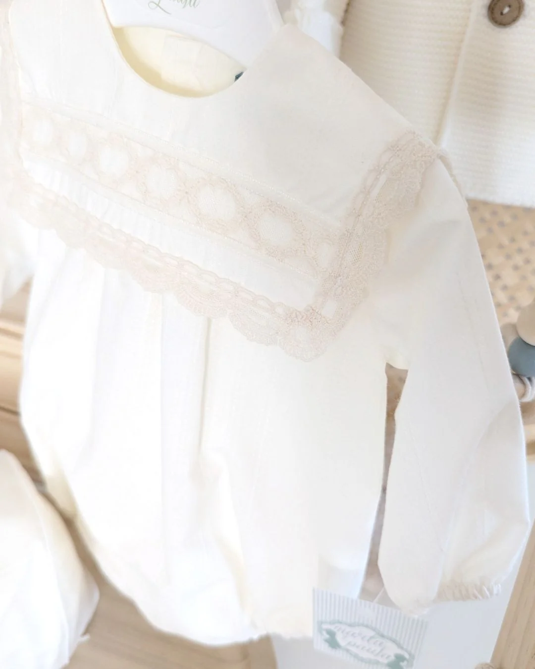 Un conjunto de ceremonia absolutamente delicado, pensado para los momentos más especiales de tu bebé. Este bombacho en tono crudo con detalles en beig y encaje de algodón combina elegancia y dulzura en una prenda única. Incluye capota a juego para completar un look lleno de ternura y sofisticación. Ideal para bodas, bautizos y celebraciones de otoño e invierno 🍂❄️