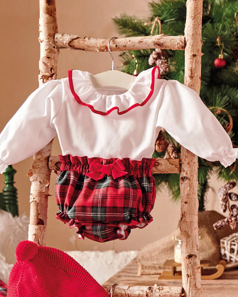 ¡No te pierdas nuestro adorable conjunto de braguita en cuadro escocés y blusa blanca con cuello volante unisex en www.tiendagrumetes.es!