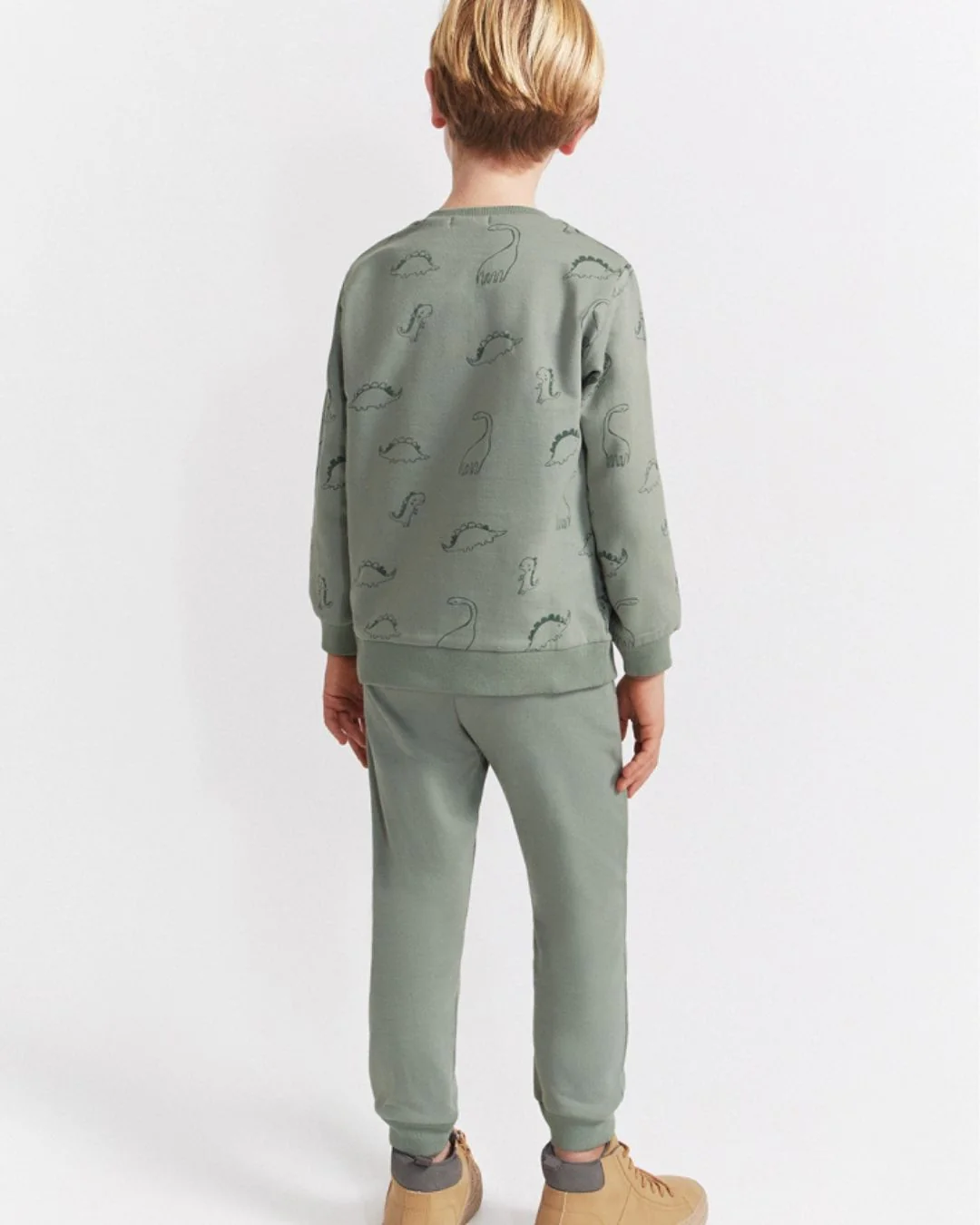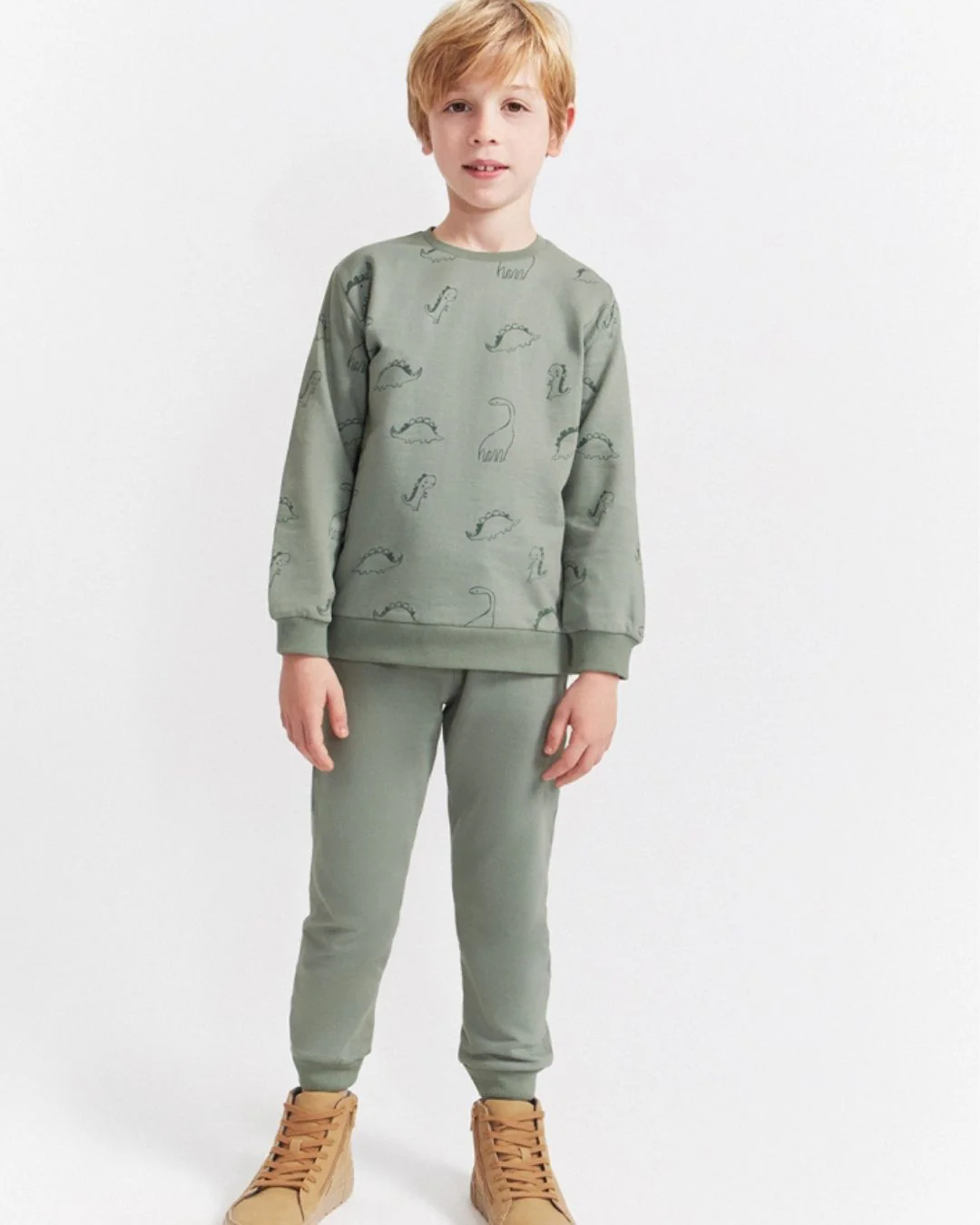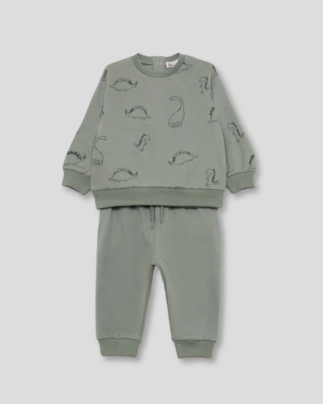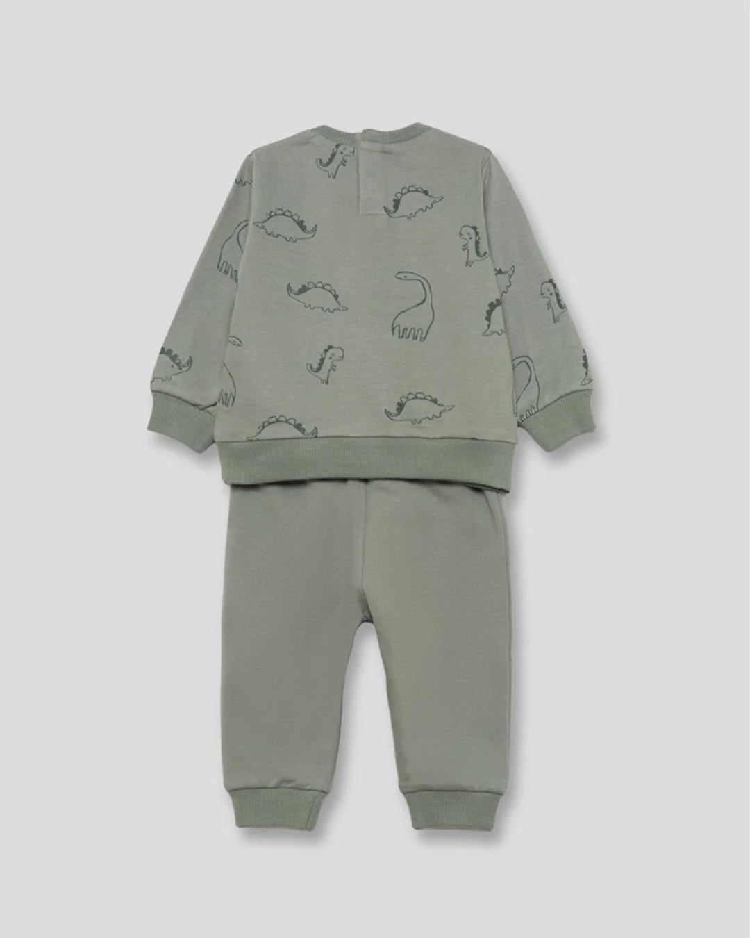 ¿Buscas un conjunto cómodo, divertido y calentito para tu peque? Este chándal verde con estampado de dinosaurios es ideal para que juegue sin parar en el parque, en casa o en la guardería 🏞️👶
