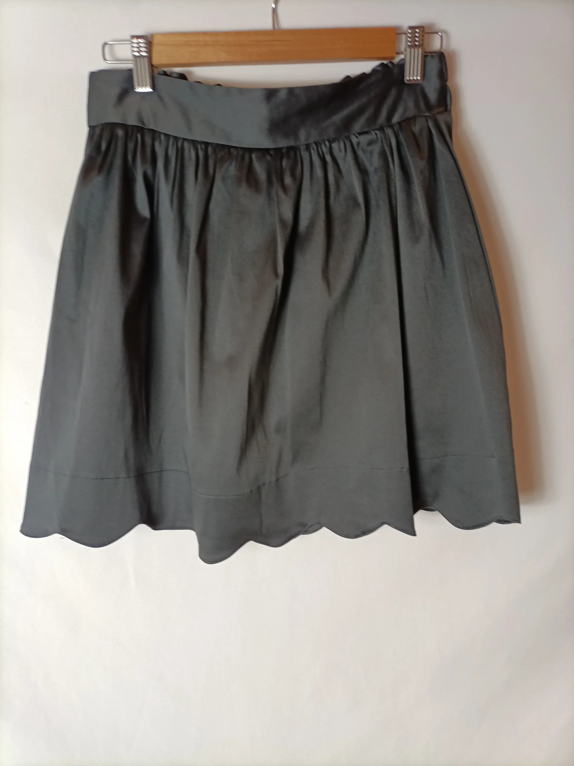 Falda corta gris de tejido satinado con la parte de abajo ondulada y cintura elástica