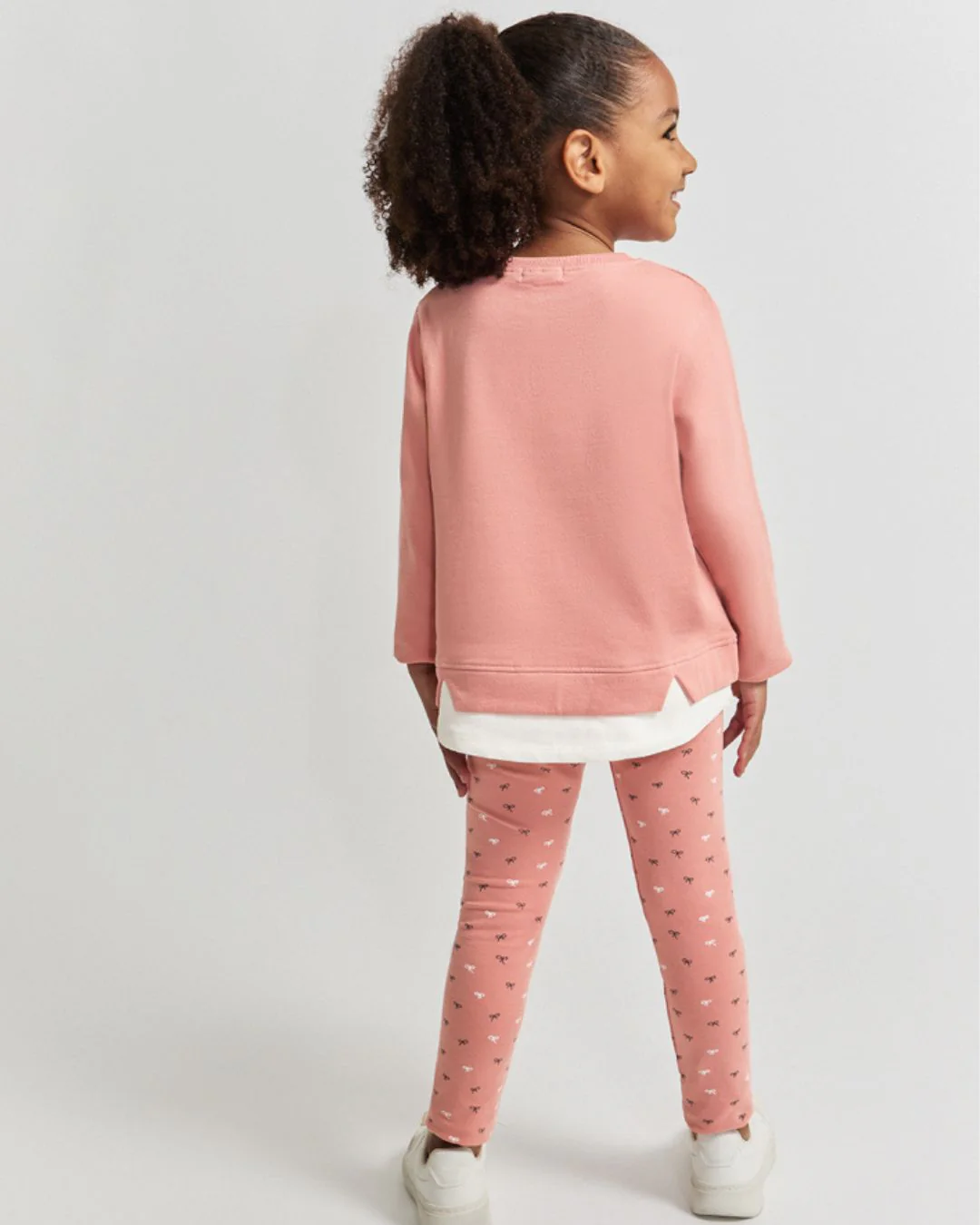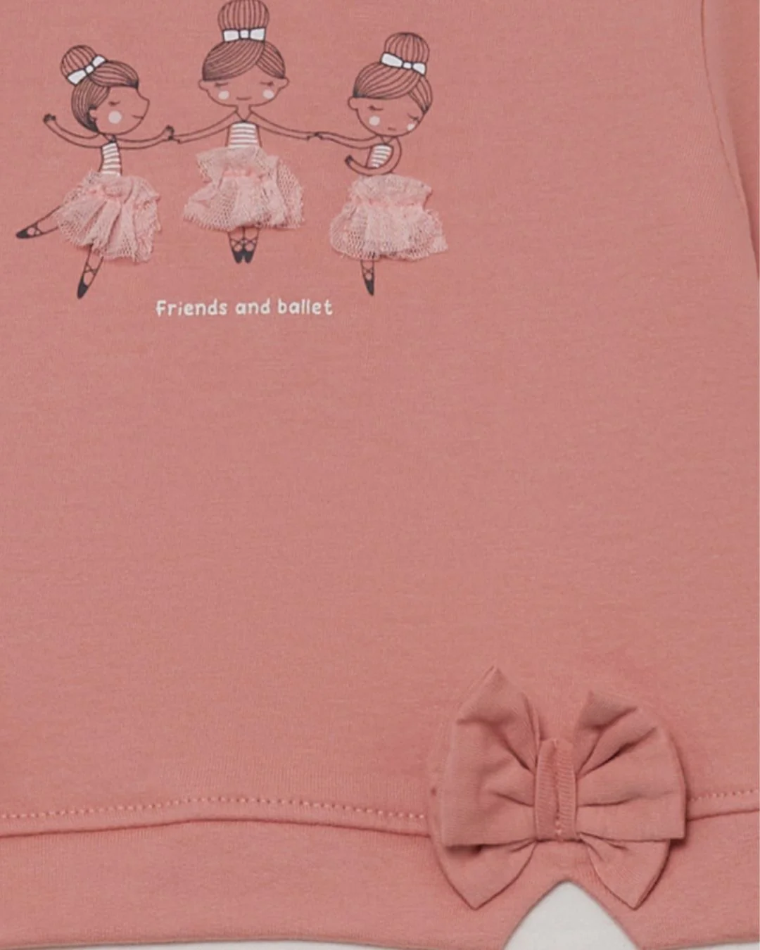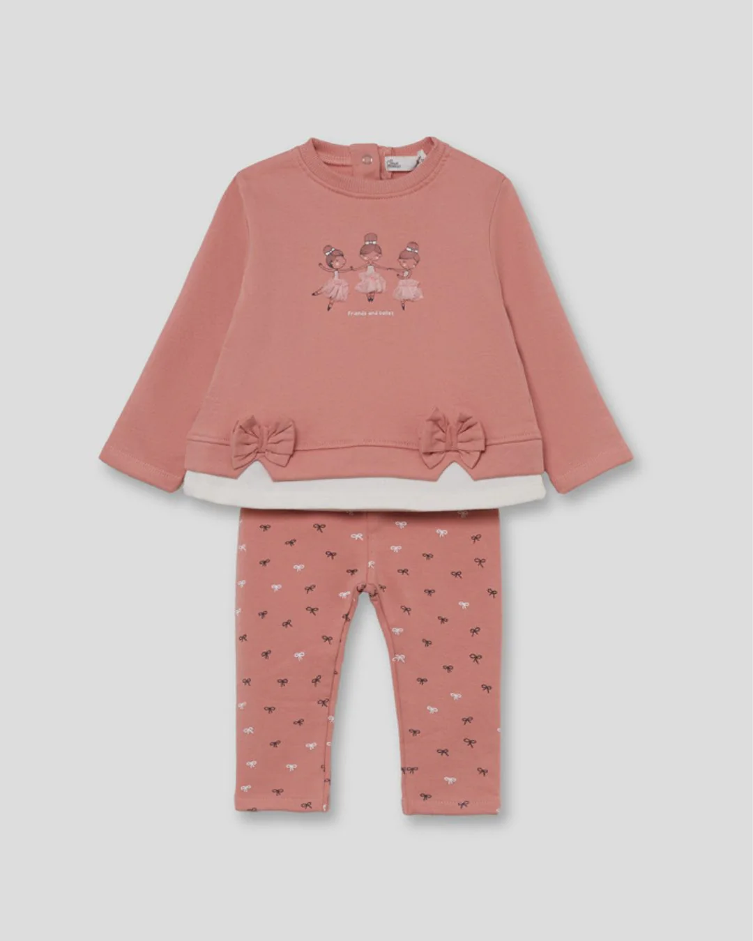 Este conjunto en color maquillaje es perfecto para un look cómodo y lleno de dulzura. La camiseta de manga larga está decorada con un estampado central de bailarinas y la frase “friends and ballet”. Incorpora dos lazos aplicados en el bajo y un falso volante en tejido blanco que asoma sutilmente por debajo. Las tallas de meses cuentan con cierre de botones en la espalda para facilitar la puesta. Los leggings, a juego en el mismo tono maquillaje, presentan un estampado de pequeños lacitos en contraste y cintura elástica para un ajuste suave y cómodo. Confeccionado en tejido afelpado suave y flexible, este conjunto es ideal para acompañar sus juegos diarios con abrigo y total libertad de movimiento.
