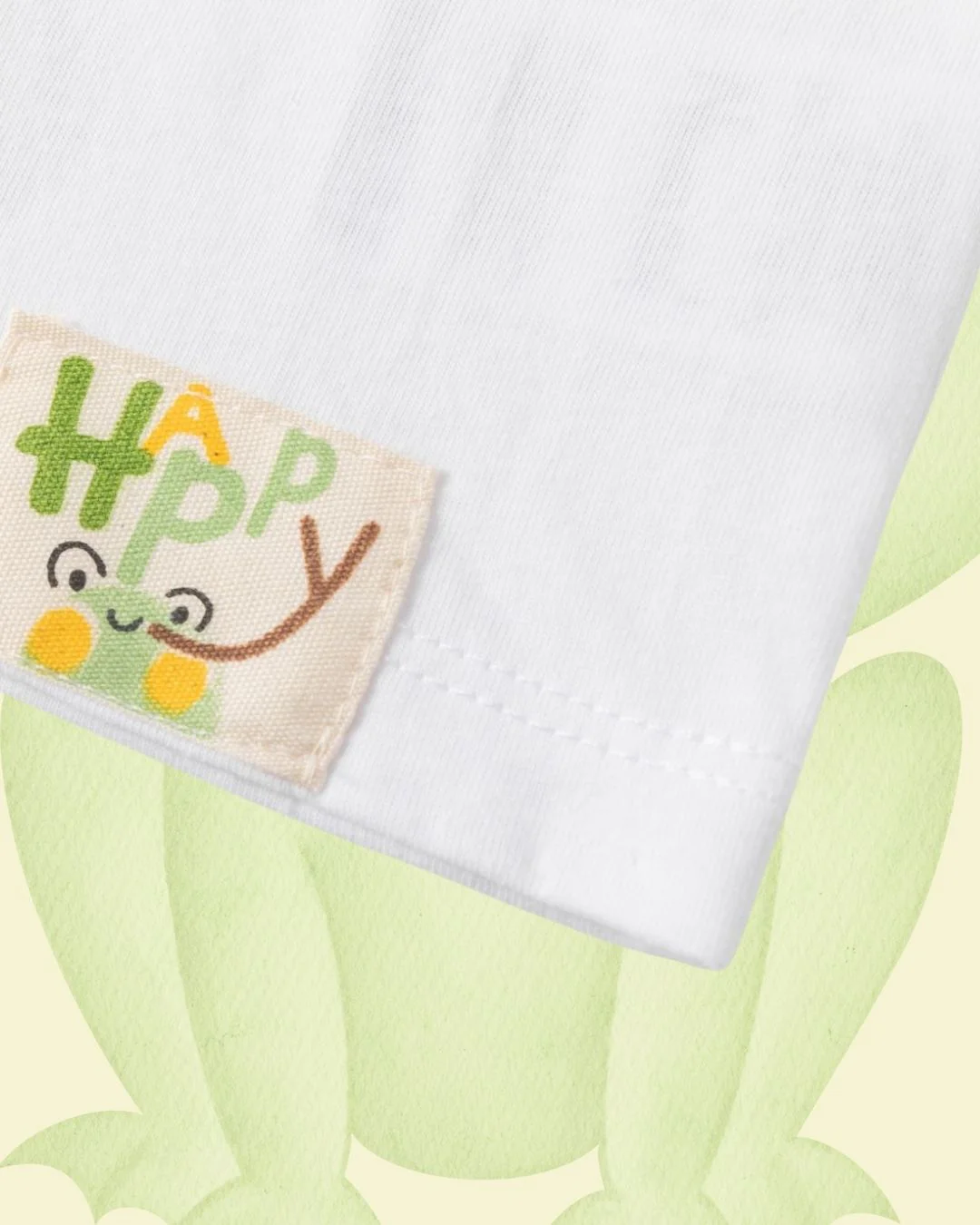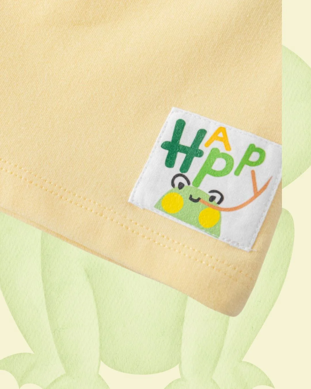 Este tierno conjunto de algodón para bebé niño incluye camiseta blanca con estampado de ranitas saludando y short amarillo claro con parche “Happy”. Perfecto como ropa cómoda, fresca y barata para bebé niño en días soleados, juegos y paseos al aire libre 🌼👶🏼