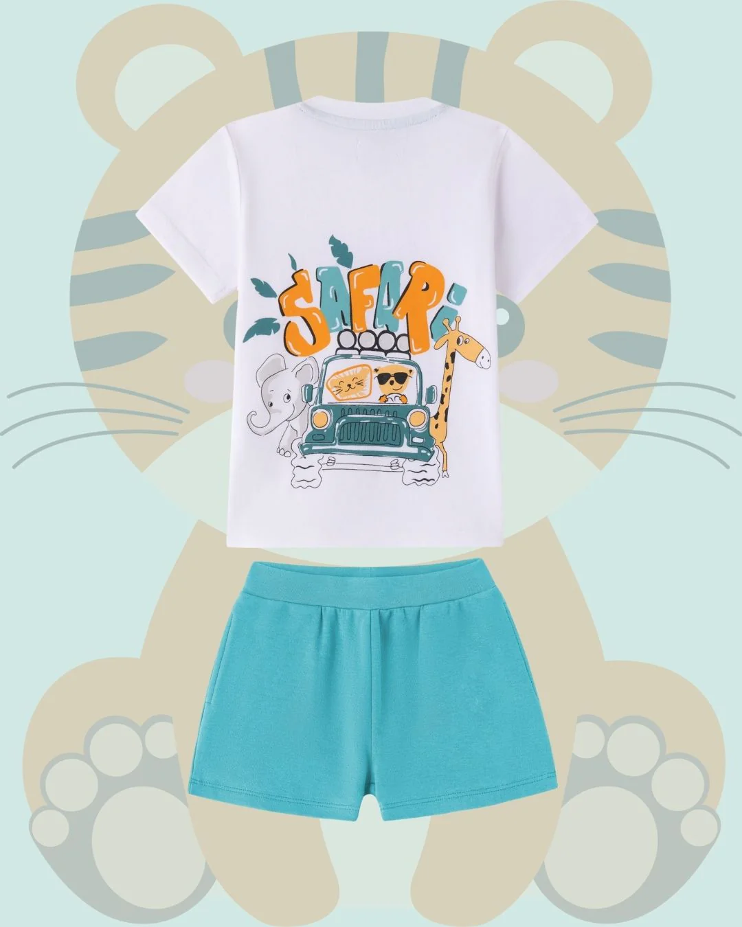 Este precioso conjunto de algodón para bebé niño es perfecto para los pequeños exploradores. Incluye una camiseta blanca con un simpático tigre en el frente y una divertida escena de safari en la espalda 🐯🦒🐘, acompañada de un short azul turquesa súper cómodo.