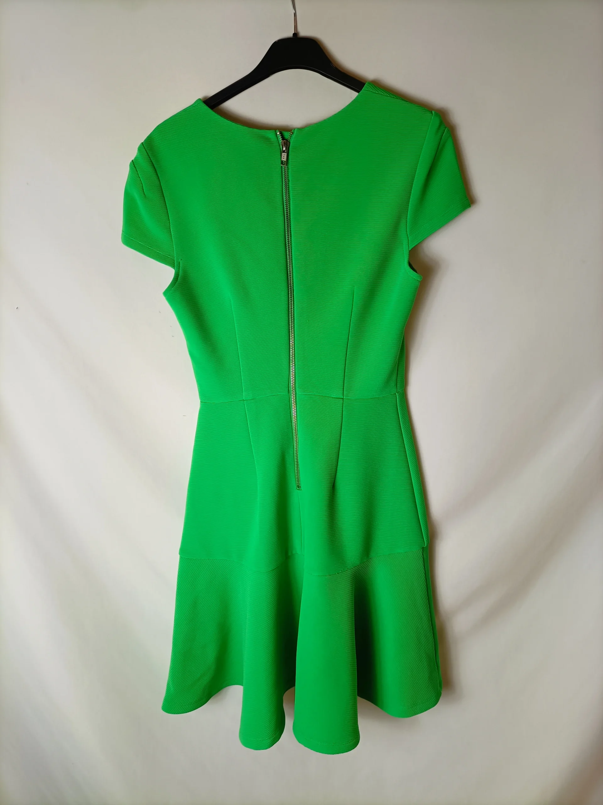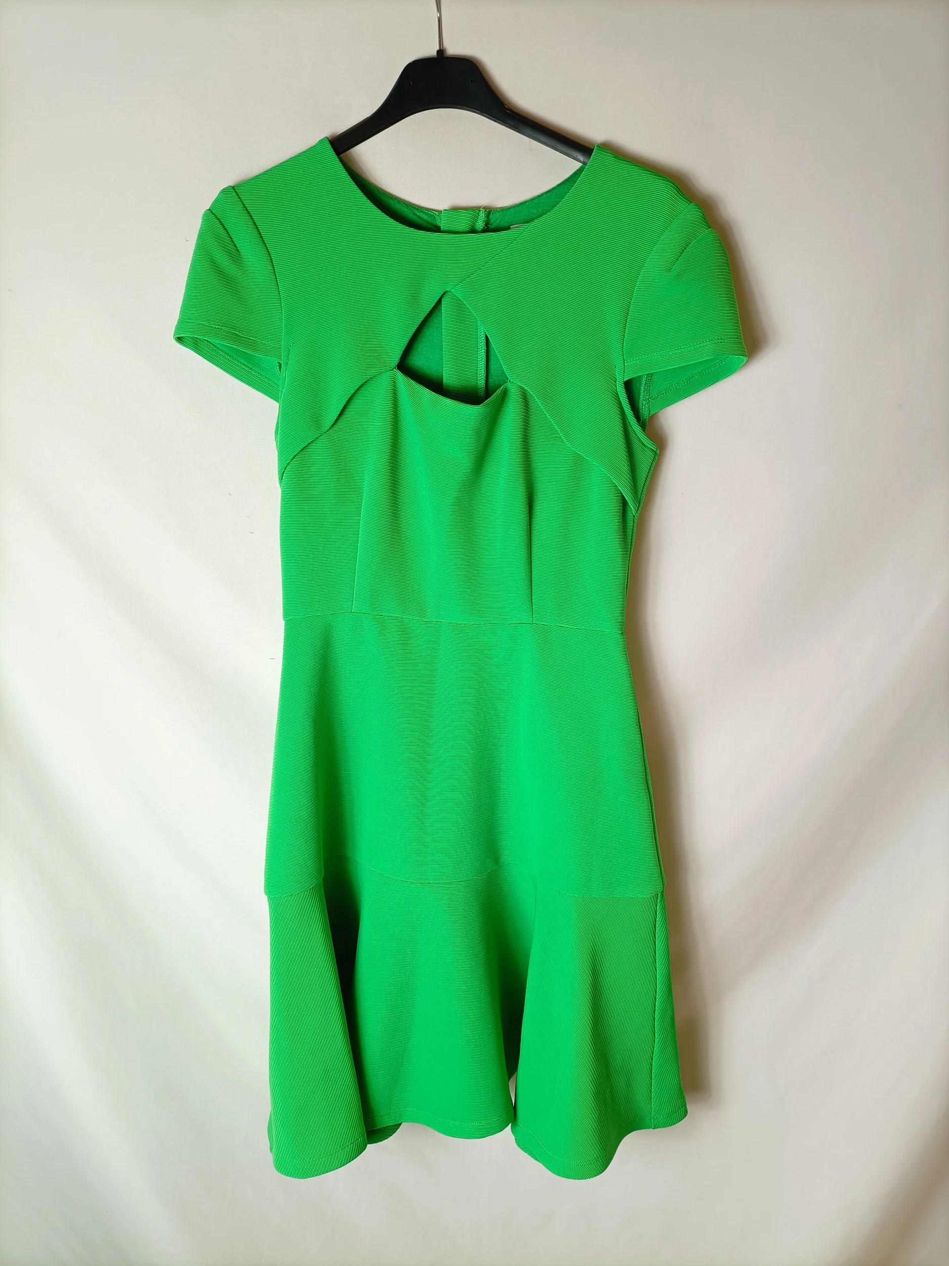 vestido corto verde con abertura delanteras, tejido elástico.