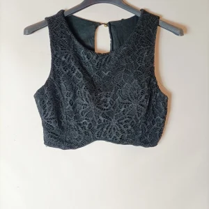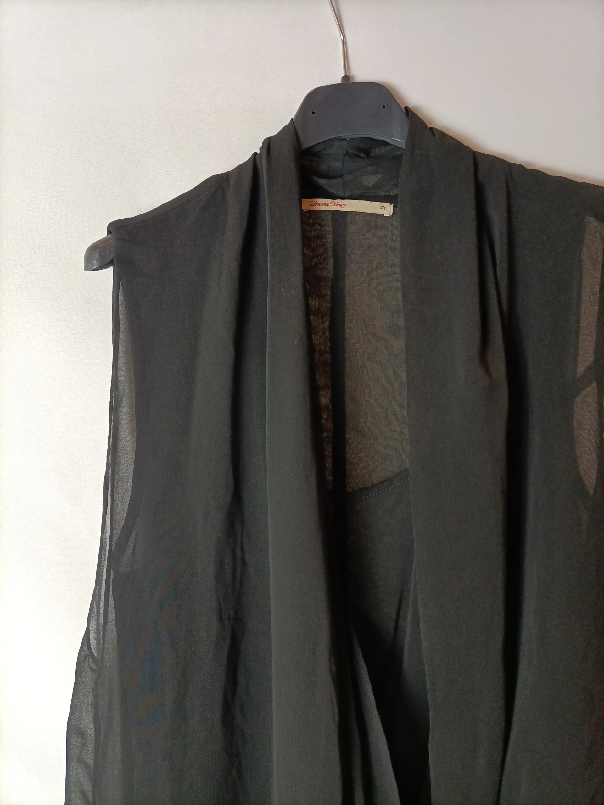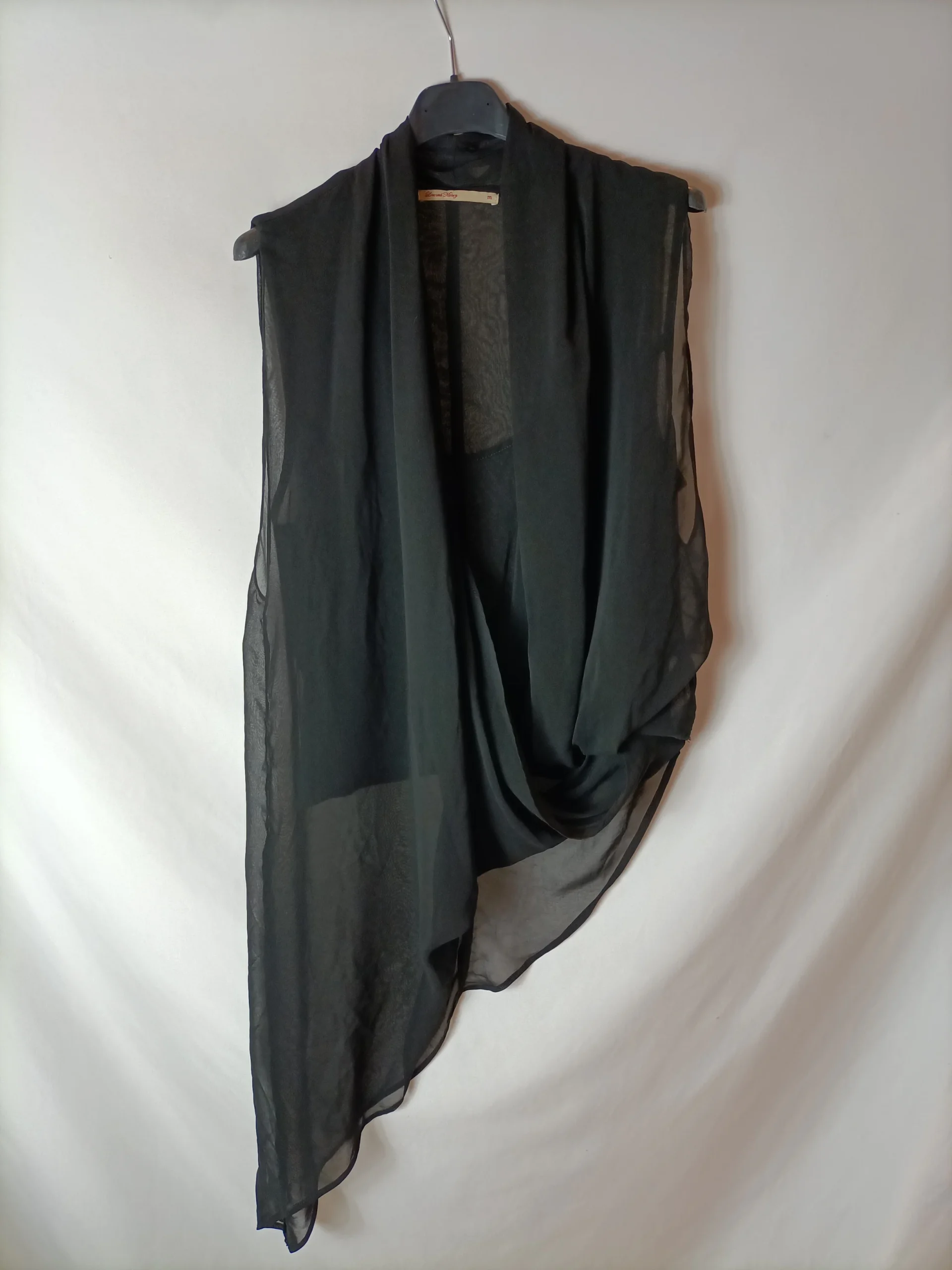 Top negros asimétrico y semitransparente. Efecto drapeado en la parte frontal. Tejido no elástico.