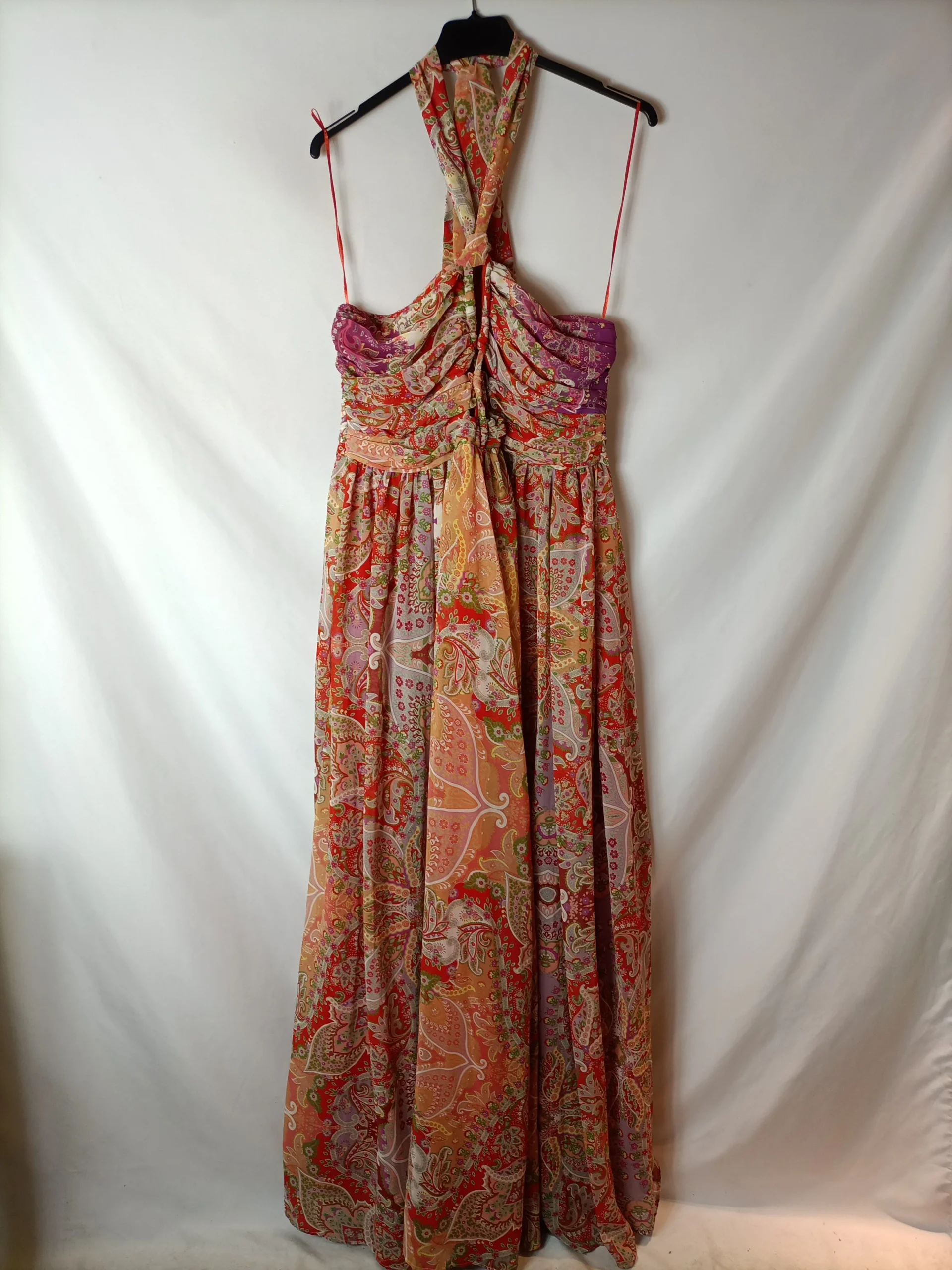 Vestido largo fluido con estampado de flores. Escote fruncido y atado al cuello.