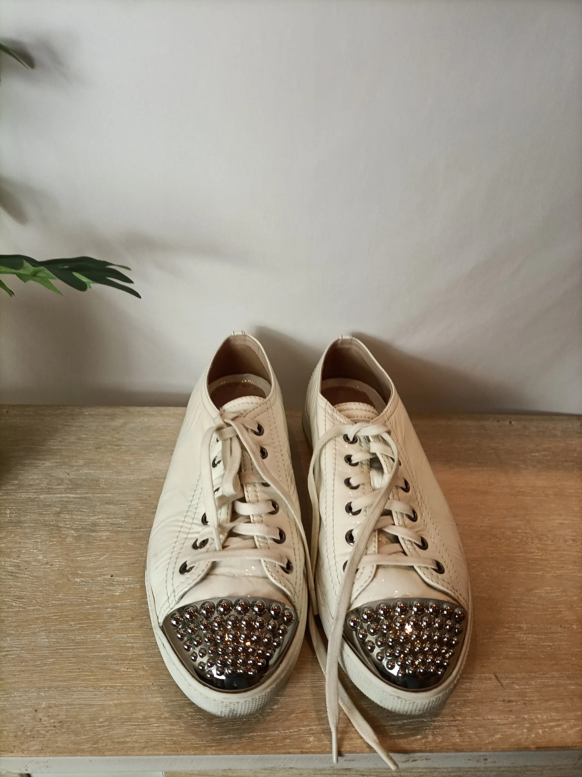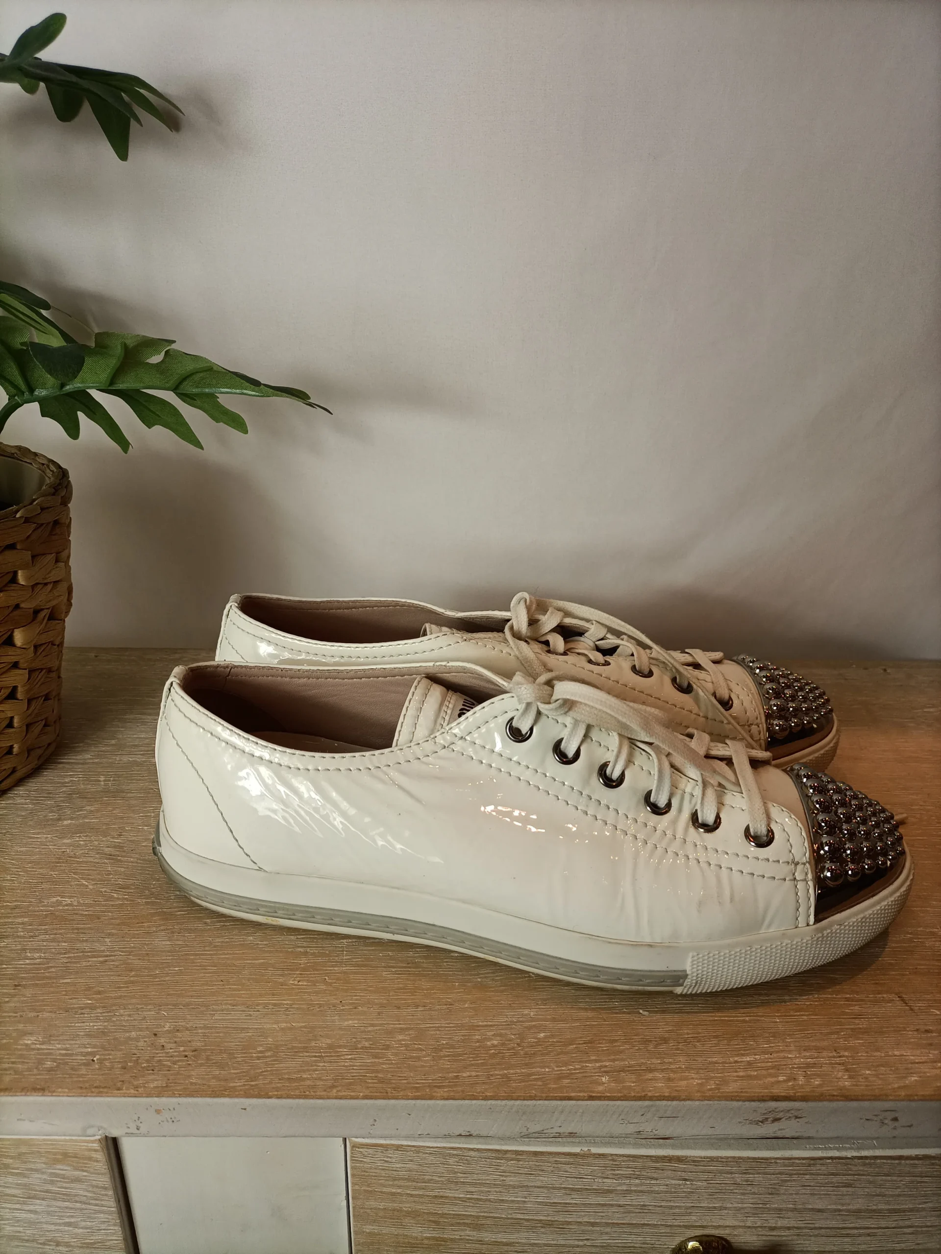 Outlet.Zapatillas charol con tachuelas en blanco