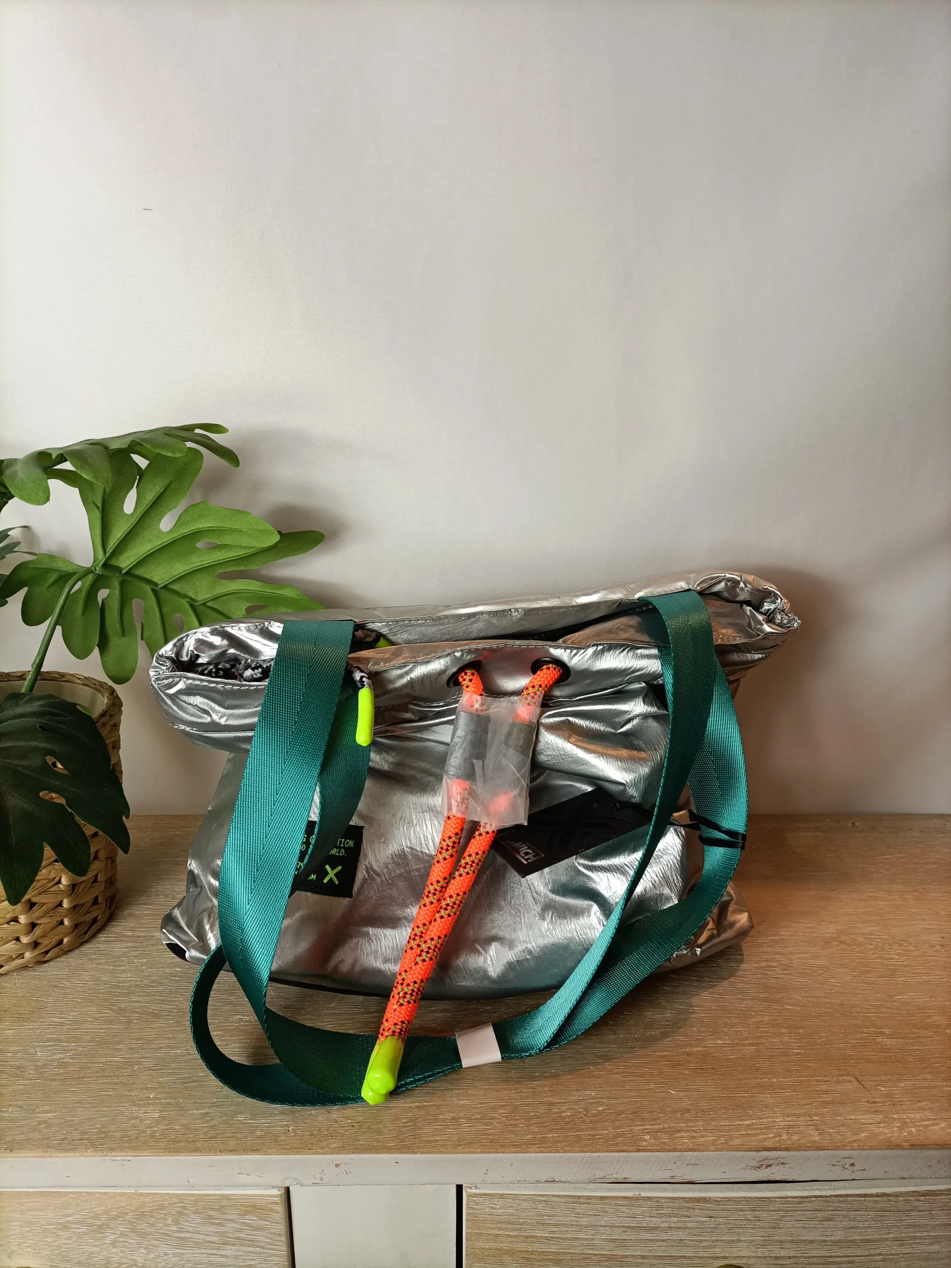 NUEVO CON ETIQUETA. Bolso plateado con detalles fluor