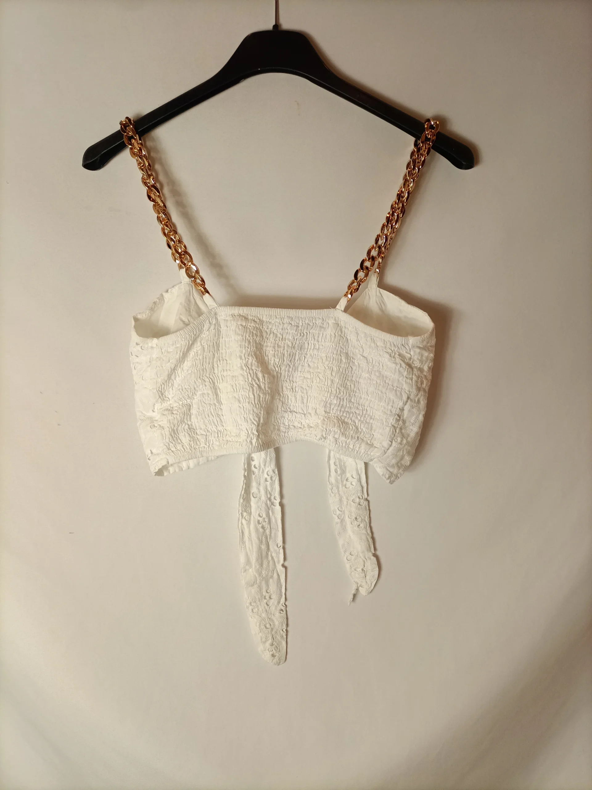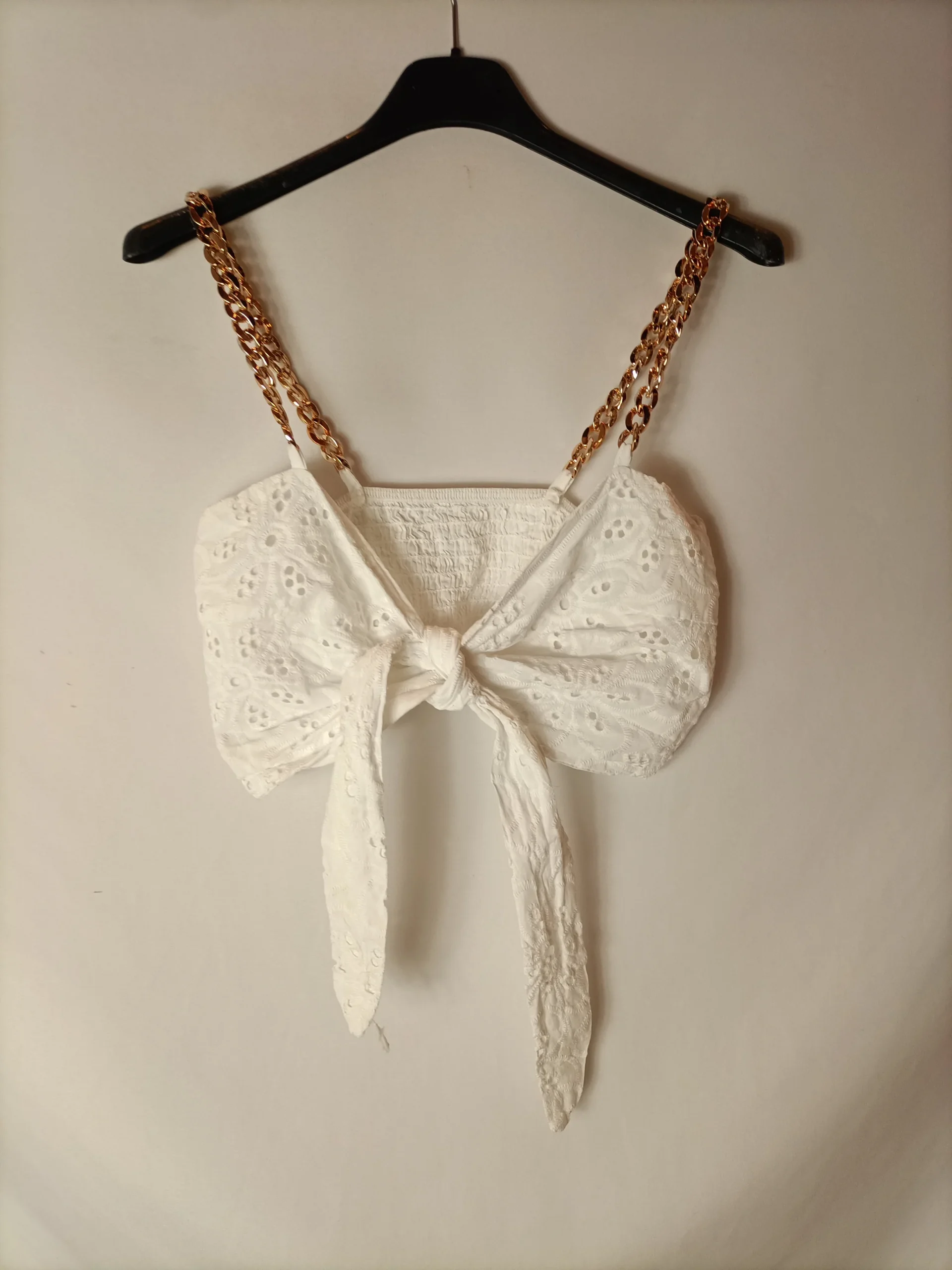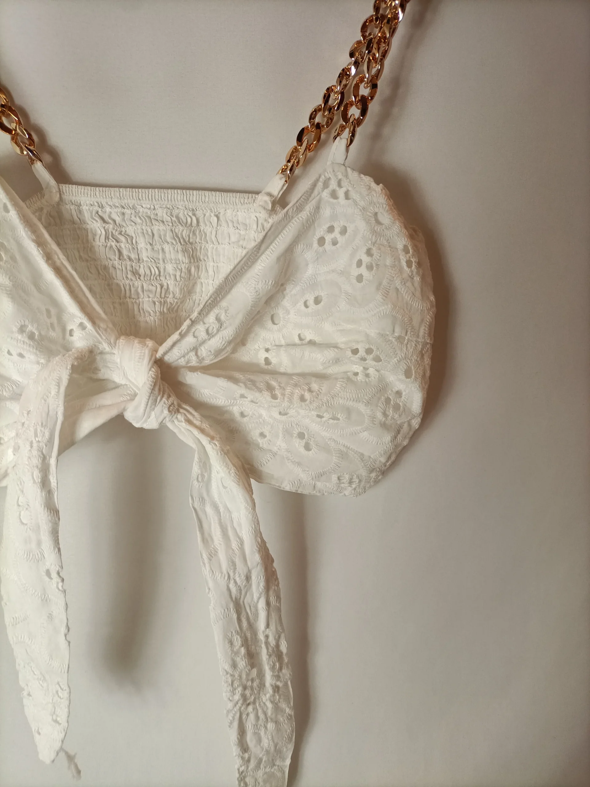 croptop blanco troquelado con lazada de adorno y tirantes de cadena. elástico por detrás.