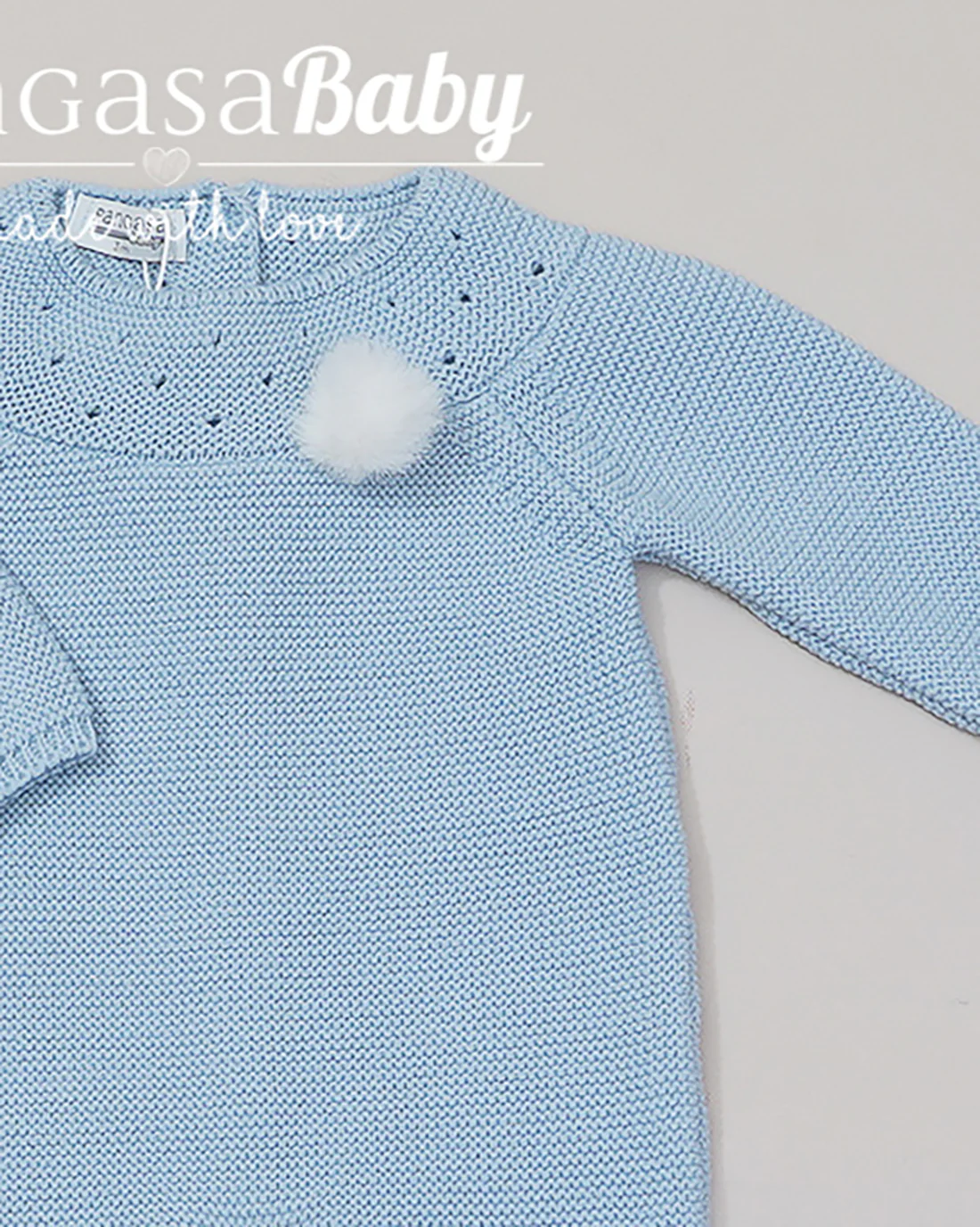 pelele celeste bebé, pelele primera puesta niño, pelele Pangasa Baby, conjunto hospital bebé niño, ropa de punto recién nacido, pelele con pompón, prenda bebé de punto, ropa para bebé recién nacido celeste, ropa de salida hospital.