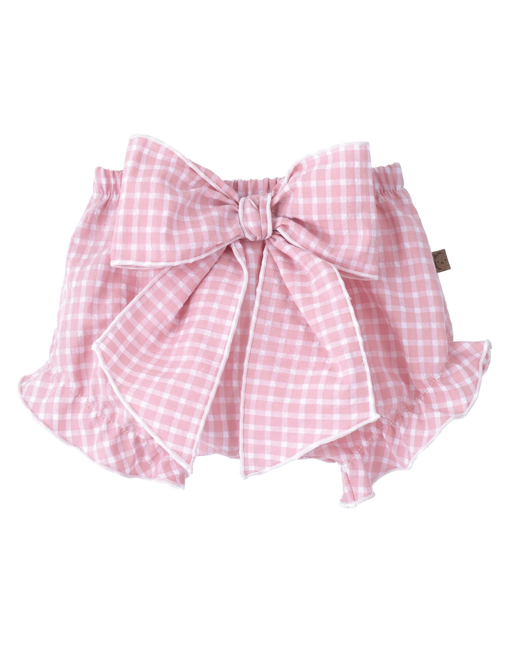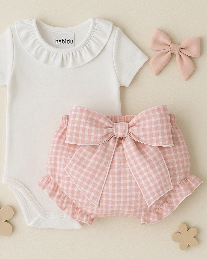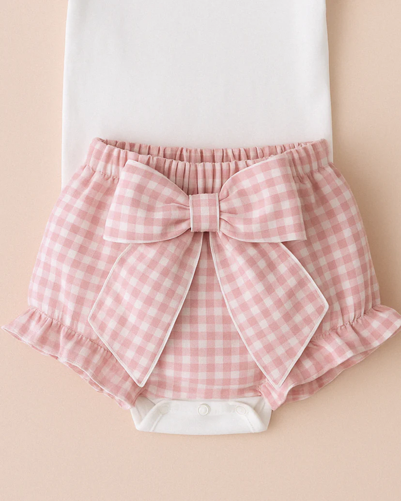 🩲 Braguita de cuadros rosa y blancos con gran lazo en la parte delantera. Este tipo de pololos son perfecto para el entretiempo con bodis de manga larga y para el verano con los bodis de manga corta.