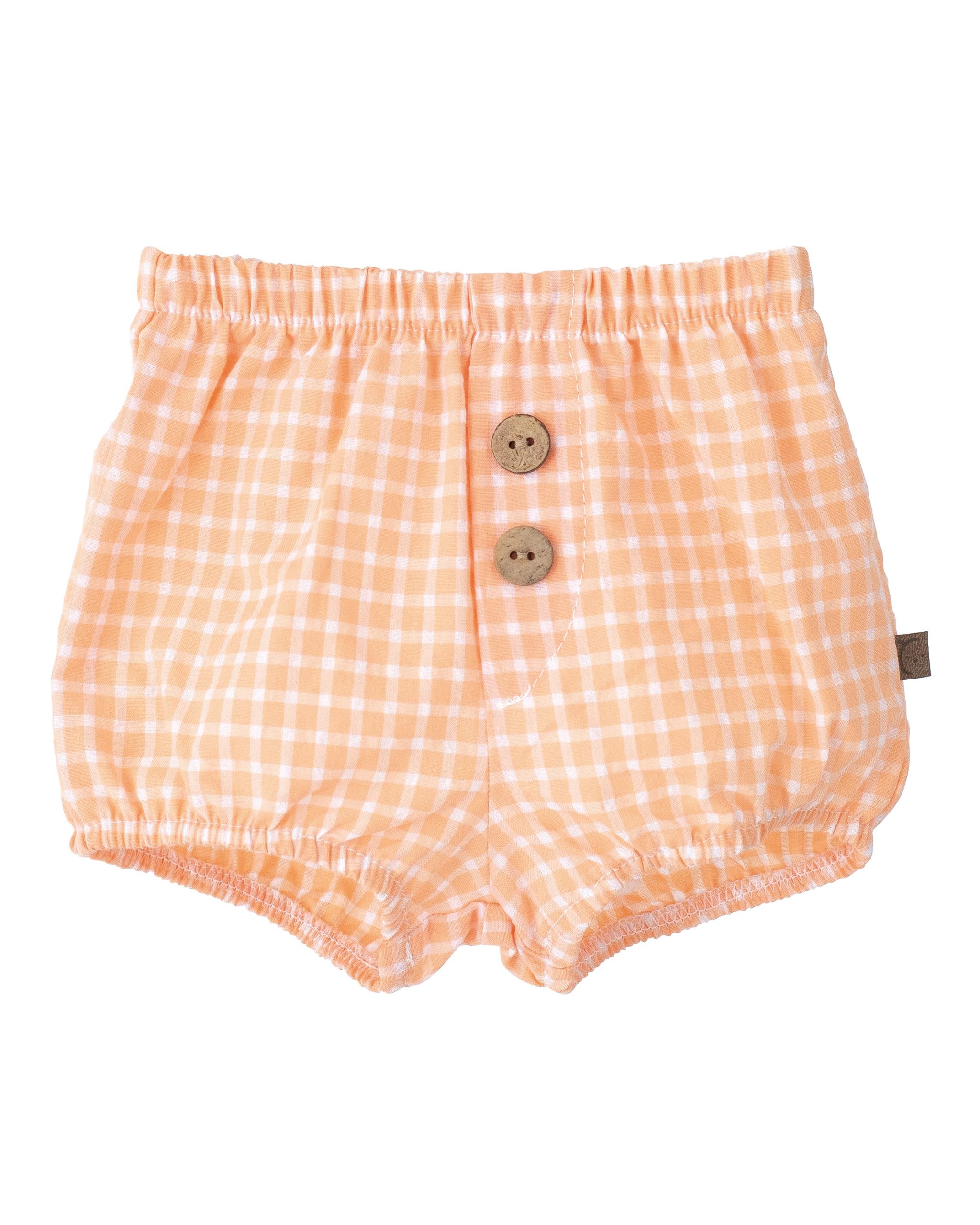 🩲 Pantalón de cuadros melocotón y blancos con botones de madera en la parte delantera. Este tipo de pololos son perfectos para el entretiempo con bodis de manga larga y para el verano con los bodis de manga corta.