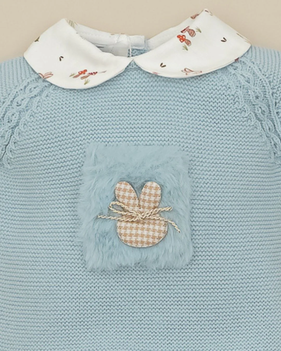 Este conjunto de primera puesta en color celeste empolvado es una de esas prendas que te enamoran a primera vista. Está compuesto por jersey y polaina de punto suave, con un delicado cuello bebé de tela estampada con florecitas y detalles de bosque. En el centro del jersey destaca un simpático conejito de cuadros sobre un parche de pelito, que aporta ese toque dulce tan característico de Pangasa Baby.