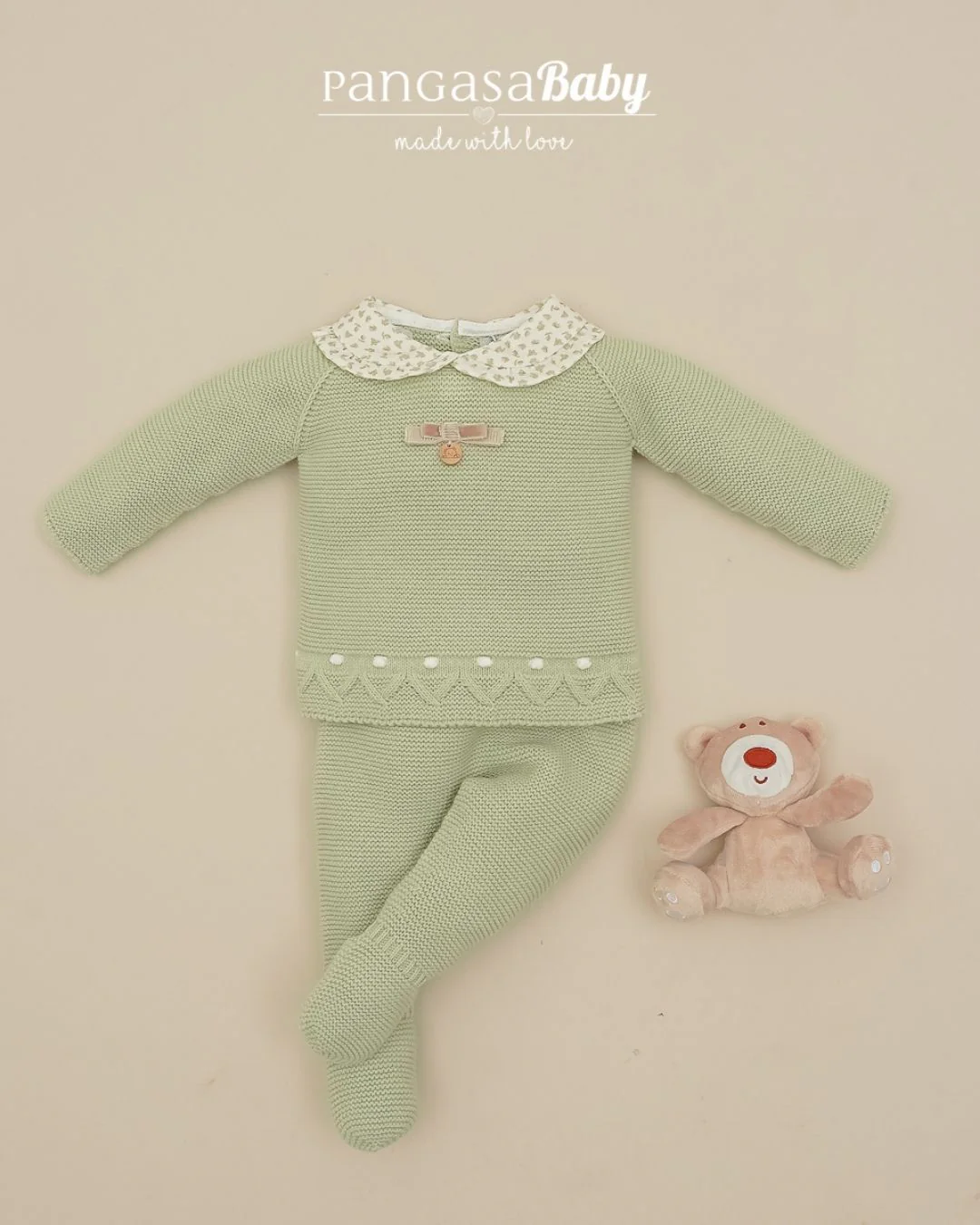 Descubre este conjunto de primera puesta de Pangasa Baby en suave punto color verde hoja, con cuello bebé estampado en florecitas, lacito decorativo y detalles calados en la parte inferior del jersey que le dan un toque elegante y muy especial 💚.