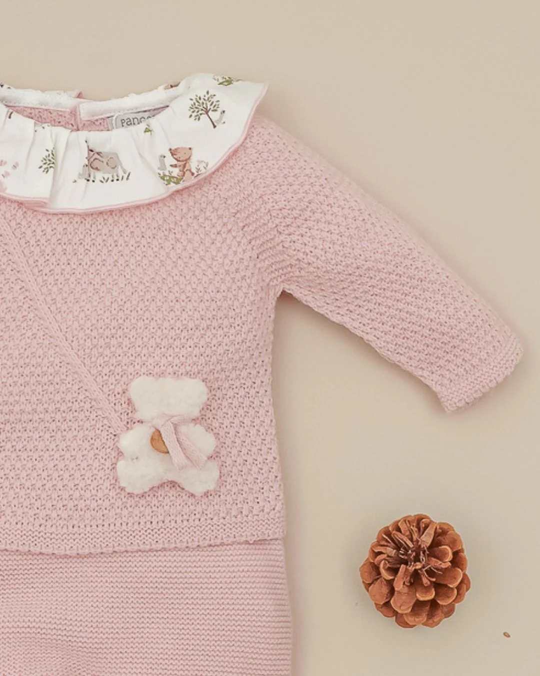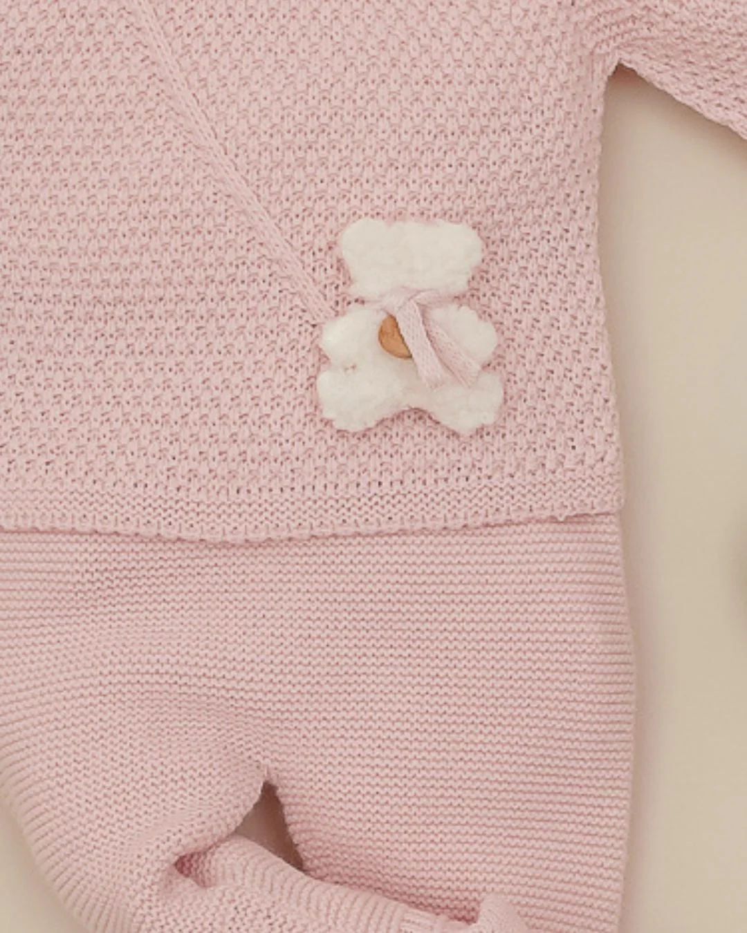 Pangasa Baby, conjunto bebé punto, primera puesta niña, ropa recién nacido, conjunto rosa bebé, ropa bebé invierno, ropa hecha en España, ropa bebé Pangasa, conjunto ositos bebé, conjunto rosa empolvado