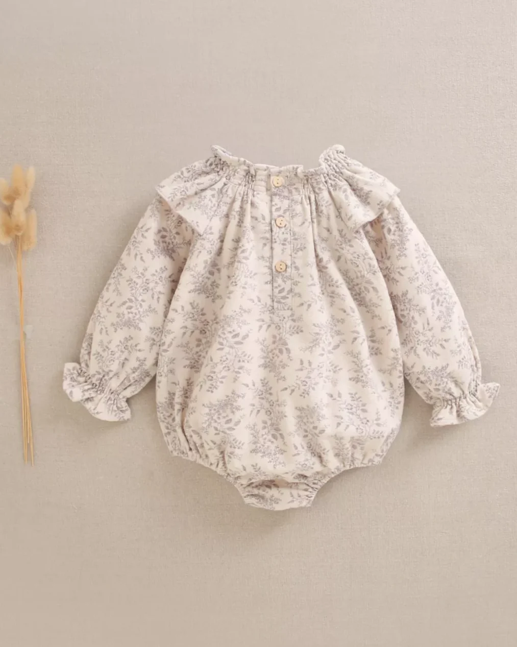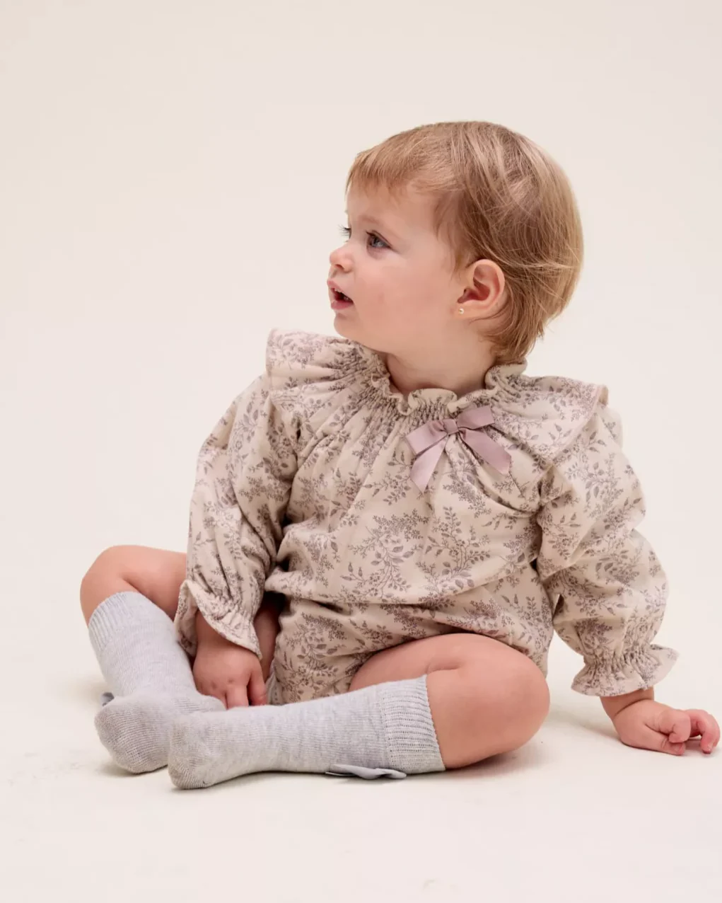 Ranita de bebé niña con estampado de hojas malva y detalle de lazo satinado en el cuello. Manga larga con puño elástico. Cierre en la espalda con botones.