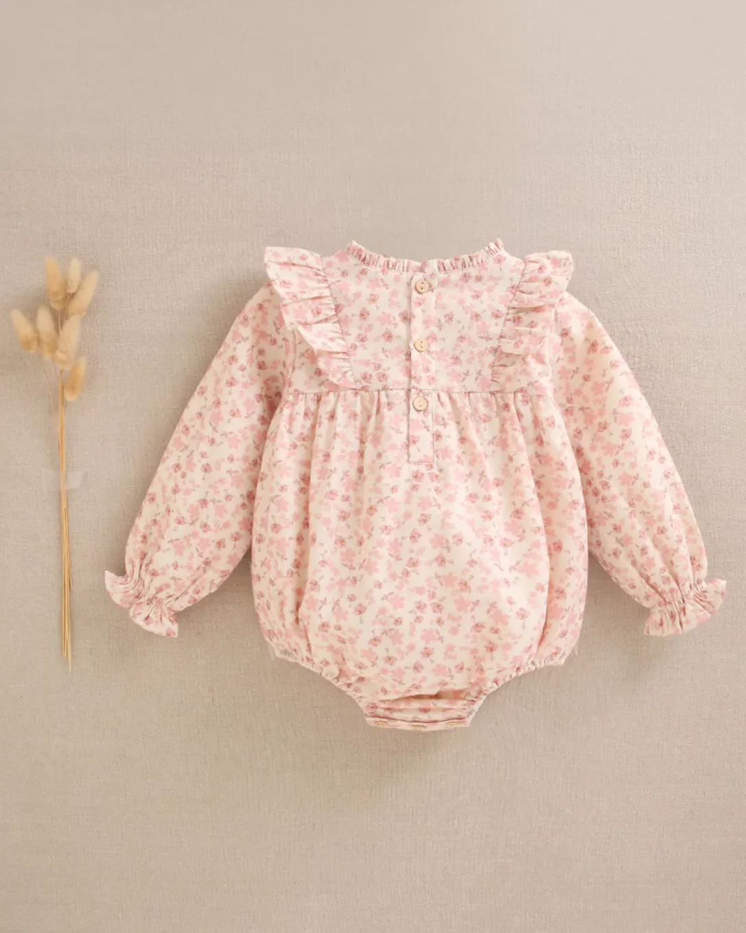 Ranita de bebé niña con estampado de flores rosas y fruncido en cuello, volantes laterales en la parte delantera, manga larga y cierre en espalda con botones.