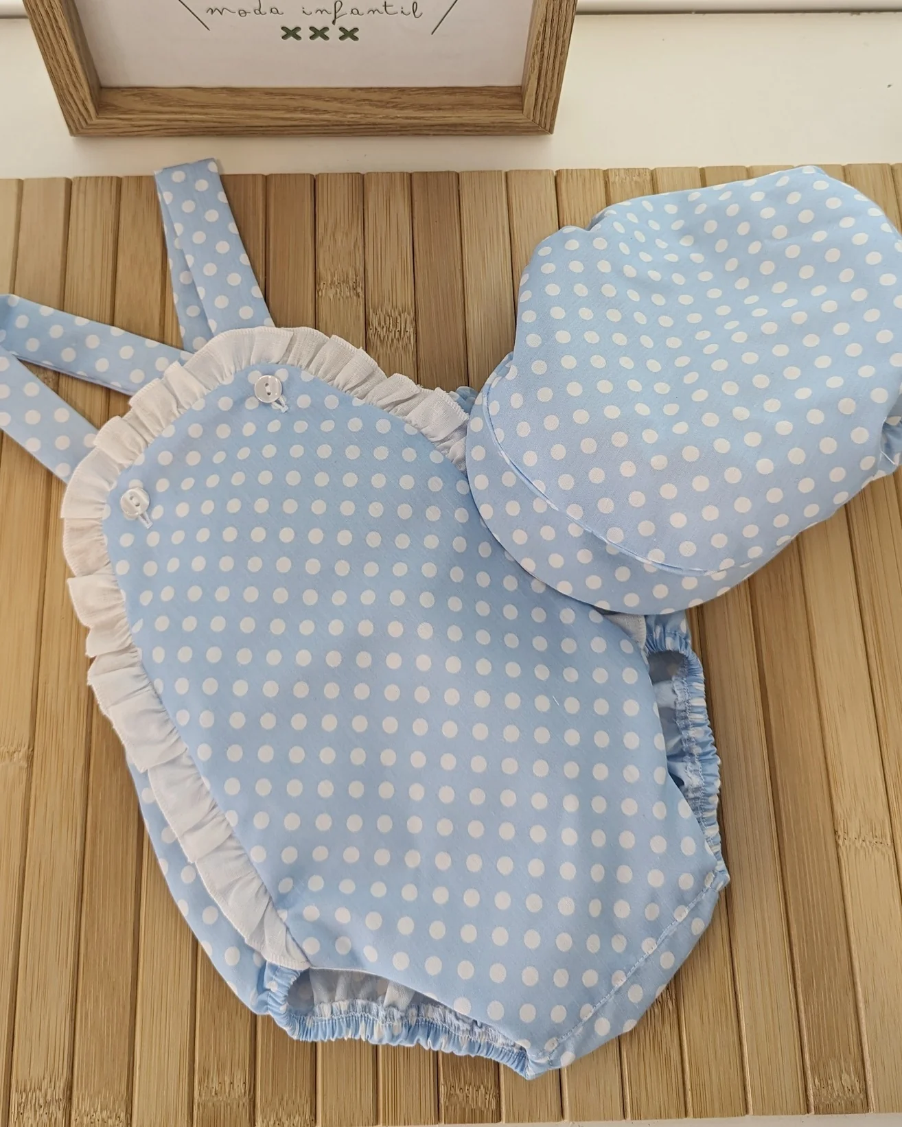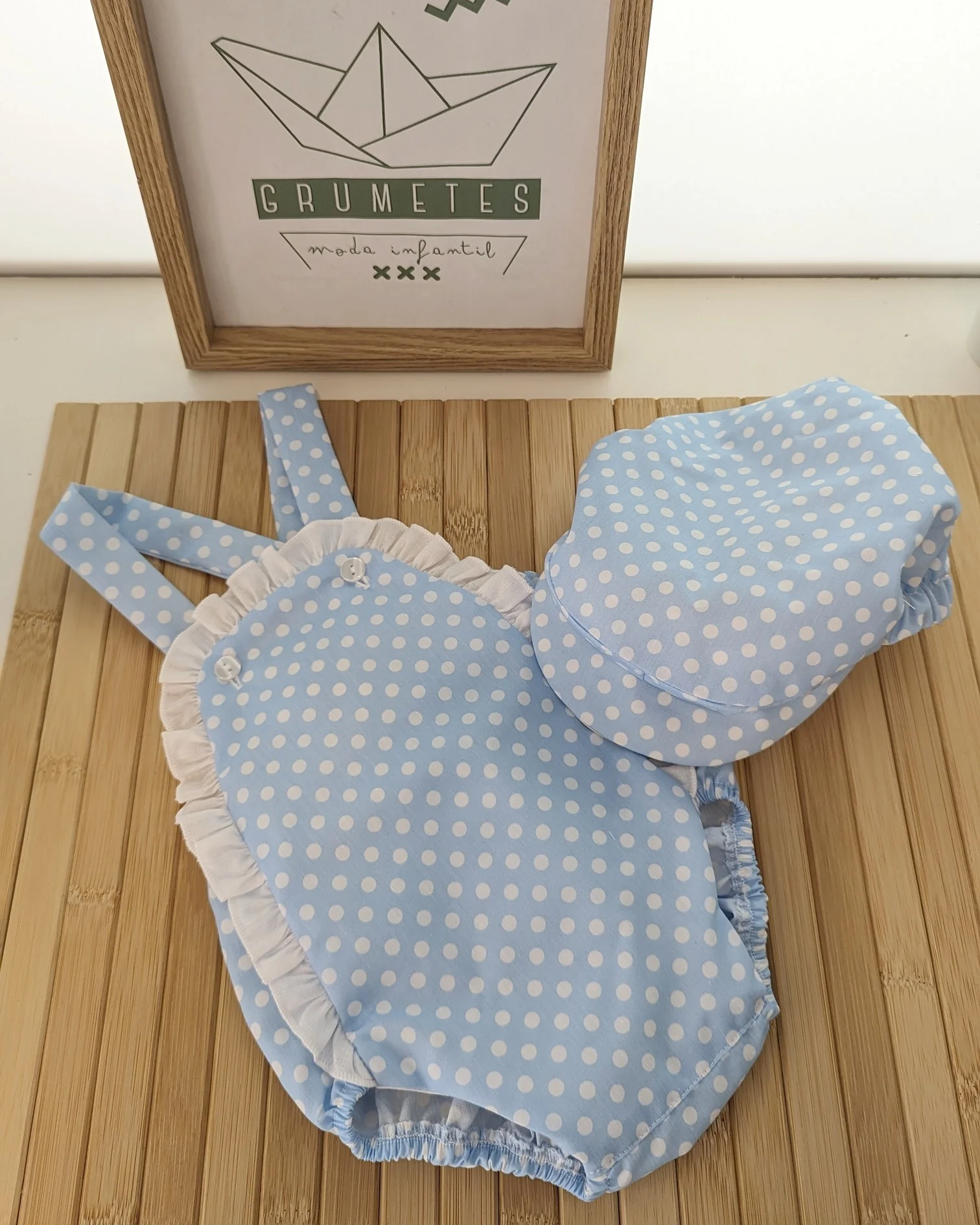 Vive la emoción de las primeras ferias con este encantador conjunto de ranita y boina en color celeste flamenco. Diseñado para que tu bebé disfrute cómodo y con estilo, es ideal para capturar recuerdos únicos en sus primeros paseos por el real.