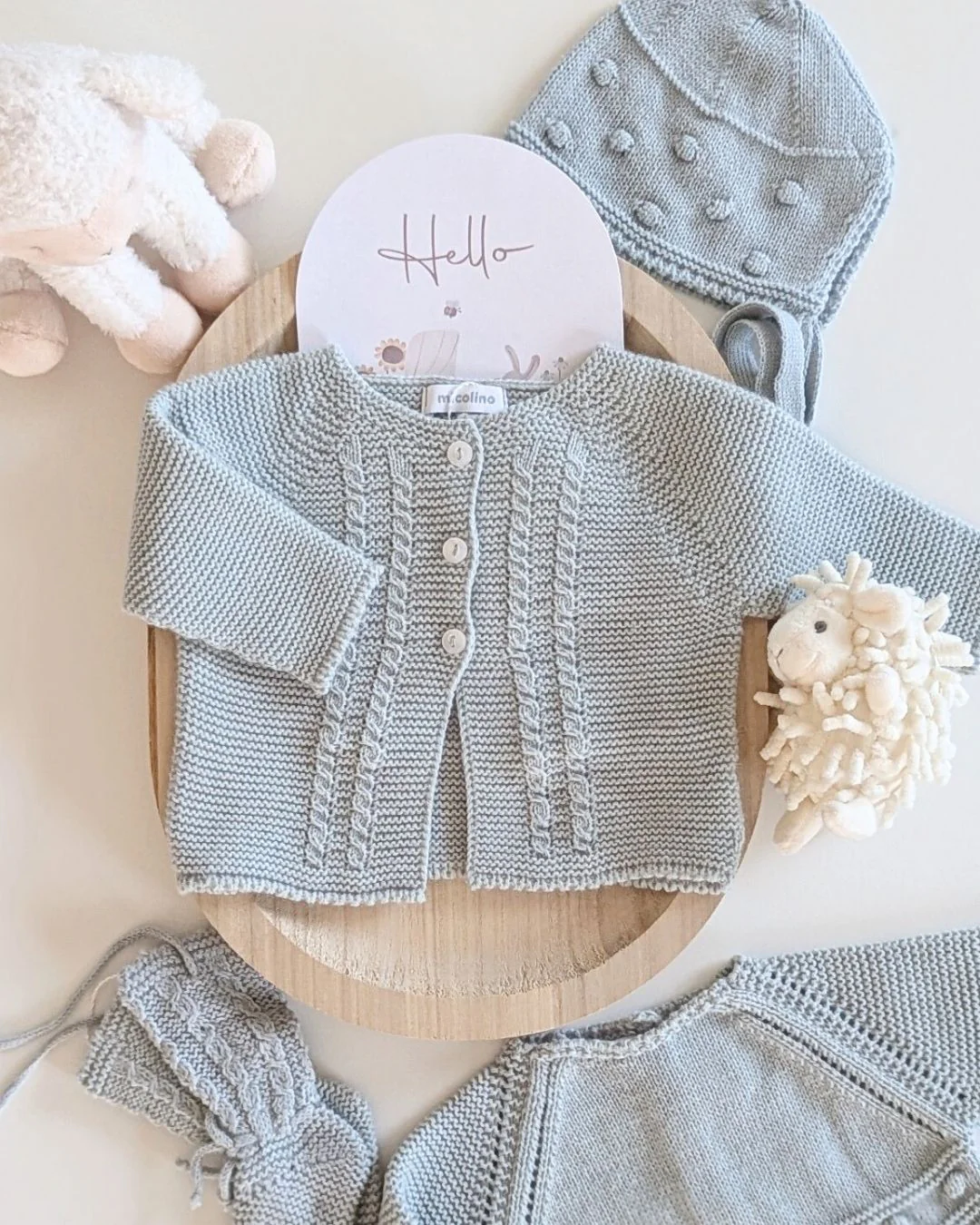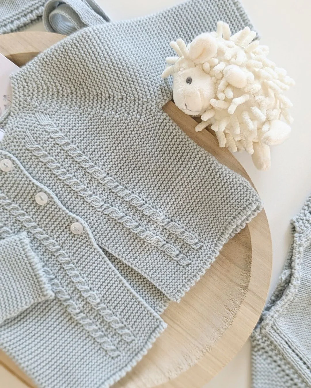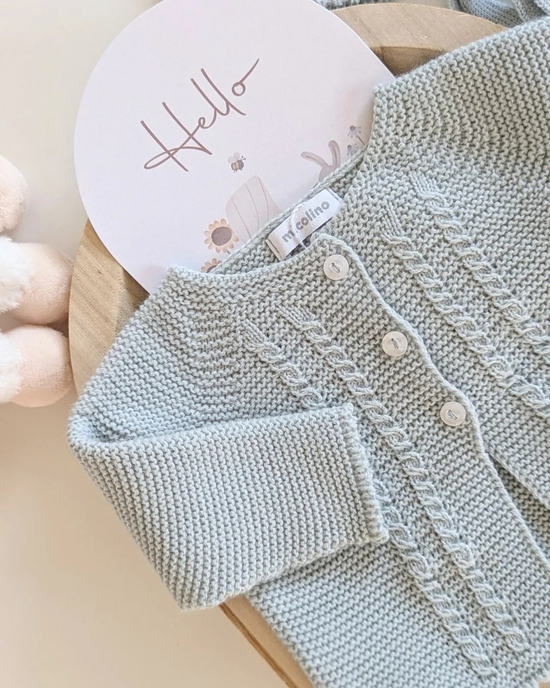 rebeca bebé, chaqueta punto bebé, Micolino Bebé, comprar online, ropa primera puesta, canastilla recién nacido, rebeca Verde Seda , ropa bebé hecha en España, Nueva colección Otoño Invierno 2025 2026 de Micolino Bebé
