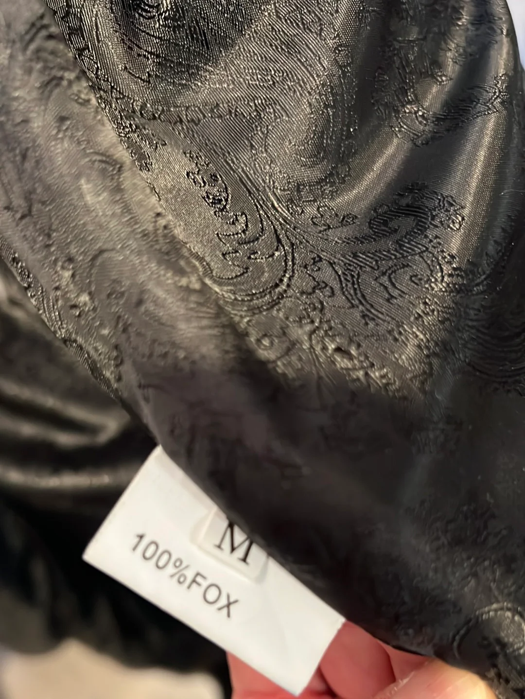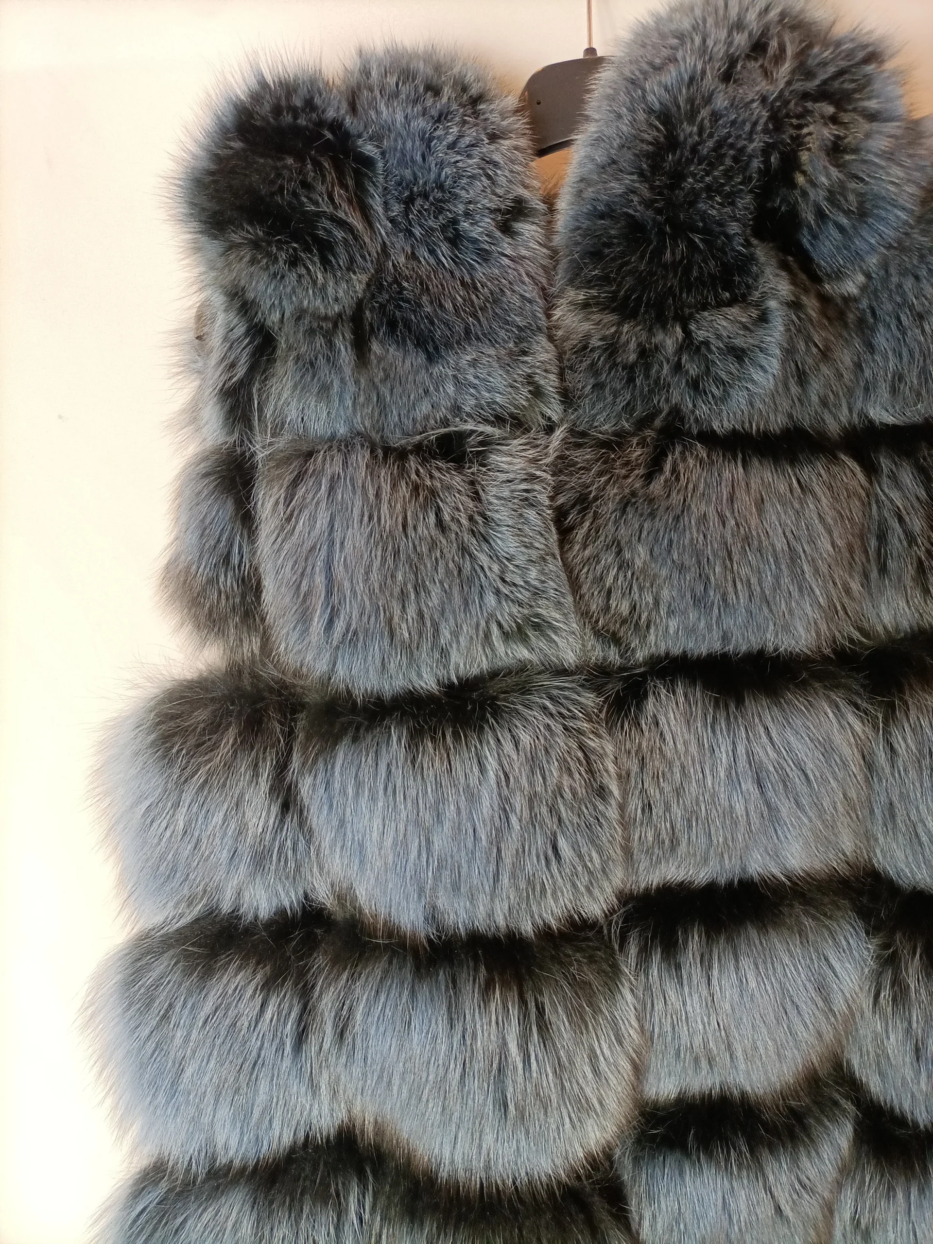 Abrigo de 100% zorro teñido. Tiene capucha y se abrocha con corchetes.