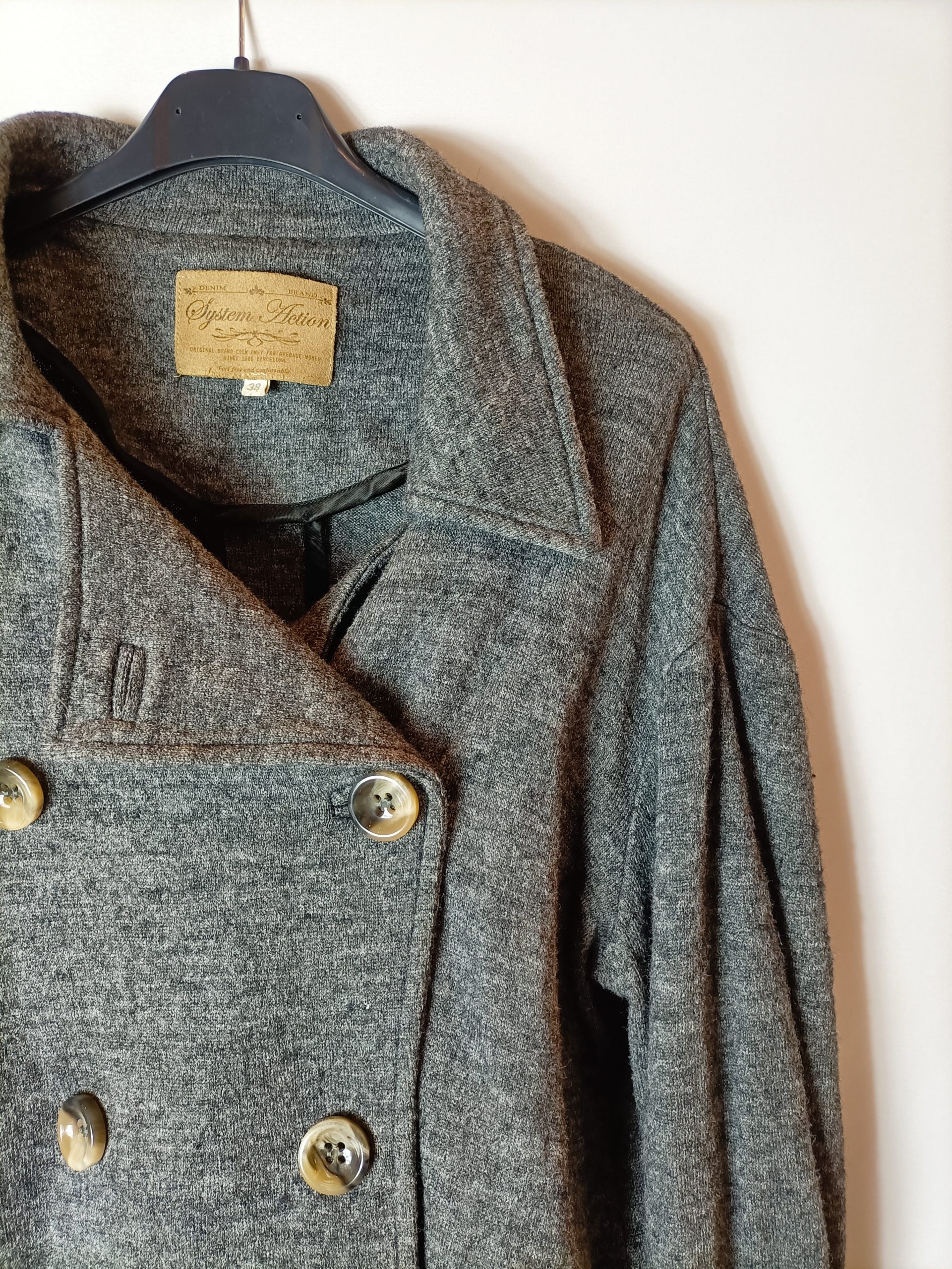 chaqueta de punto gris jaspeada. Botones de nácar. elástica y cruzada.