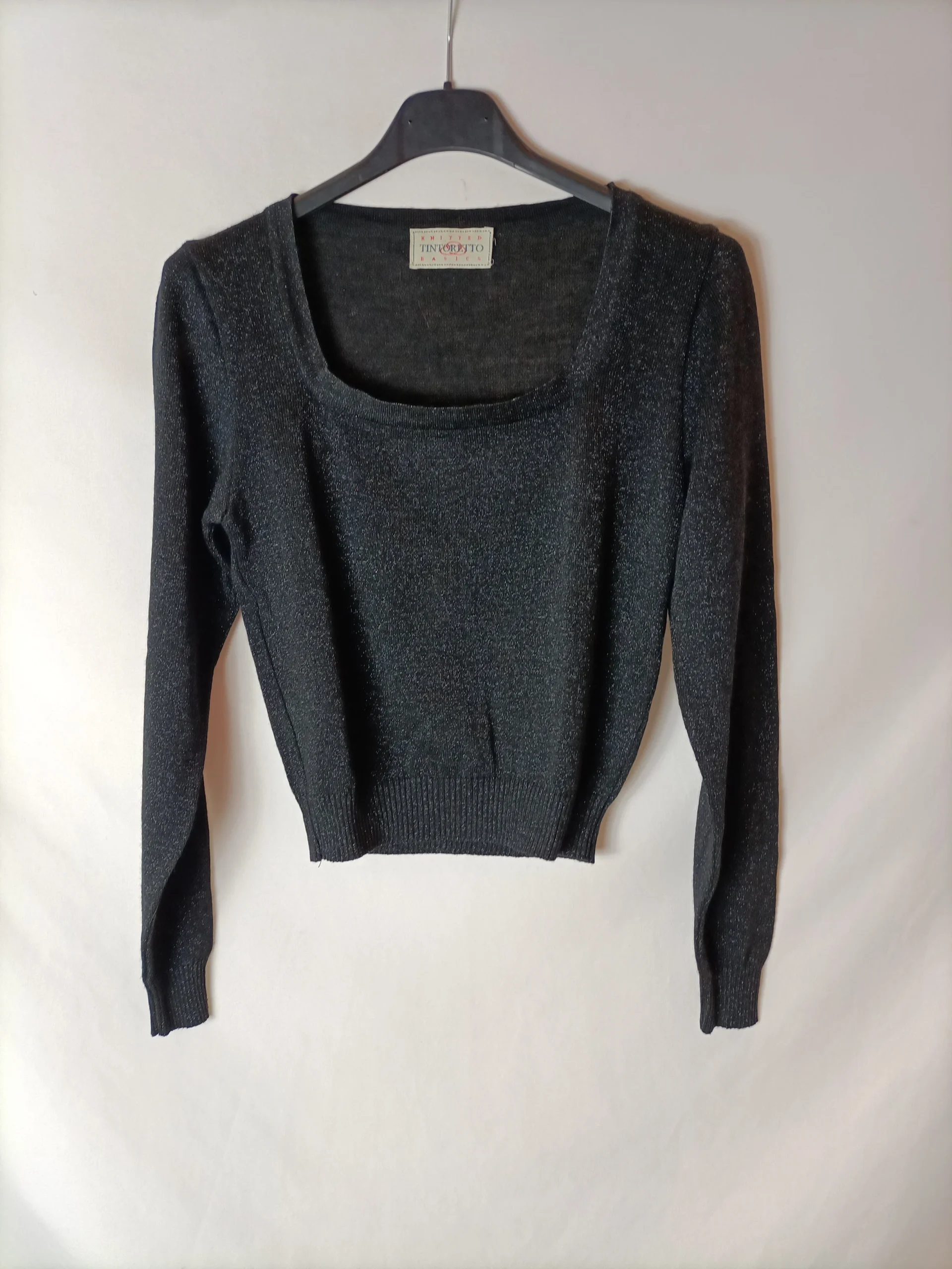 Jersey corto negro con hilos plateados. Escote cuadrado.