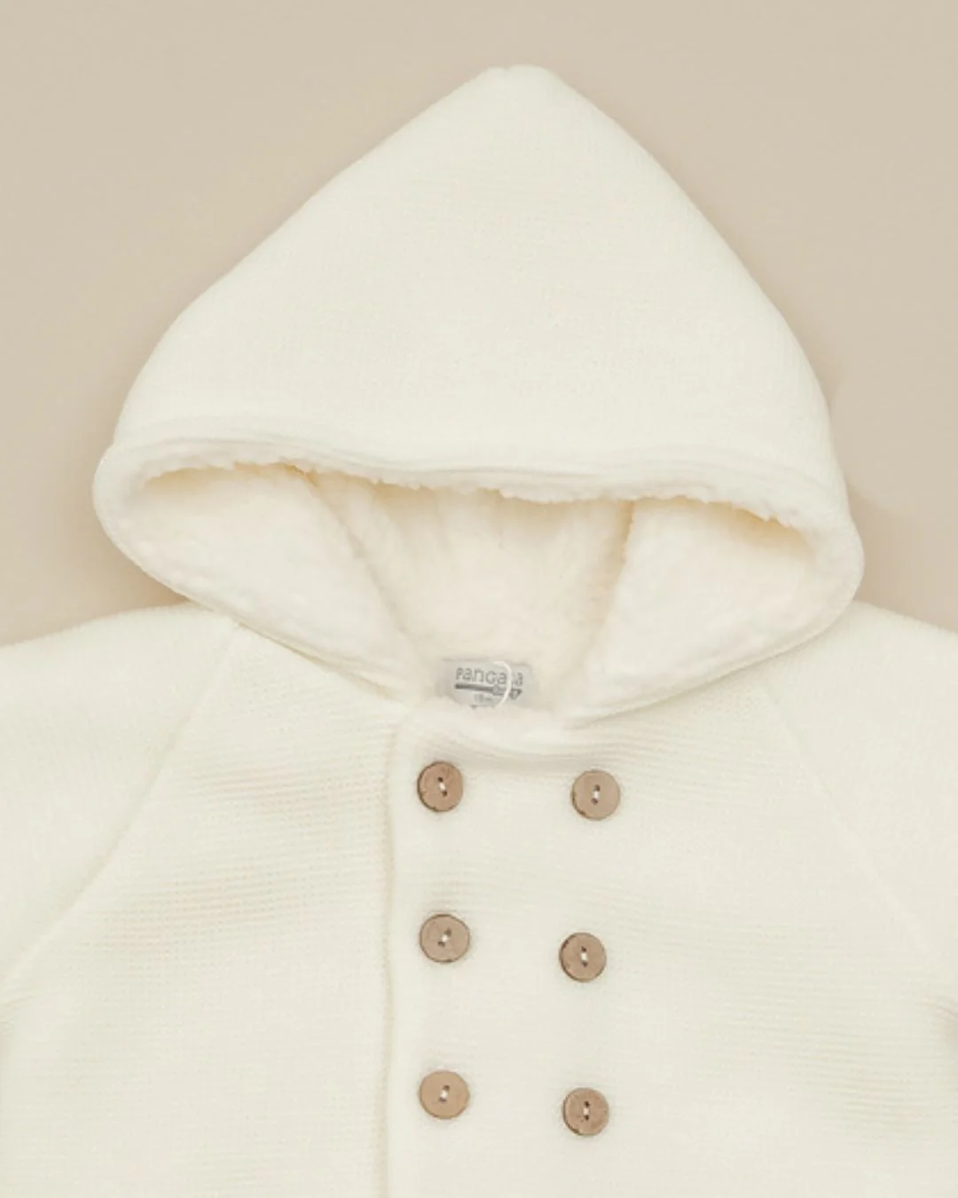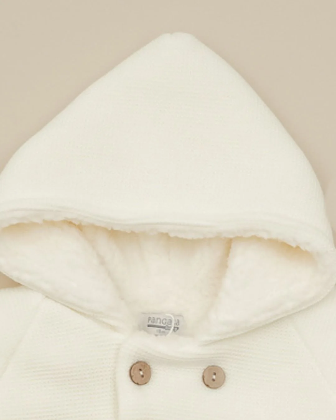 abrigo bebé neutro invierno, trenka punto bebé beige, chaqueta punto con capucha, ropa abrigo Pangasa Baby, trenka arena bebé, abrigo bebé niño niña, ropa exterior para recién nacido, trenka con forro cálido, prenda de punto para bebé.