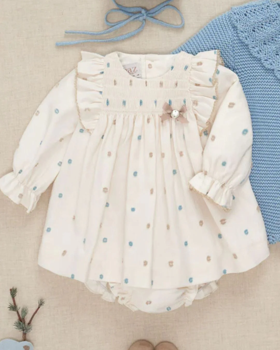 Descubre este precioso vestido de bebé con braguita a juego, perteneciente a la Nueva colección Otoño Invierno 2025 2026 de Paz Rodríguez. Una prenda confeccionada con mimo en tejido suave y delicado, con un encantador estampado de topitos en azul y beige sobre fondo crudo. Destacan los volantes con puntilla en los hombros, el canesú fruncido y el lacito con botón nácar que aportan ese toque clásico tan especial. Ideal para los días más dulces de tu bebé 🍂💛
