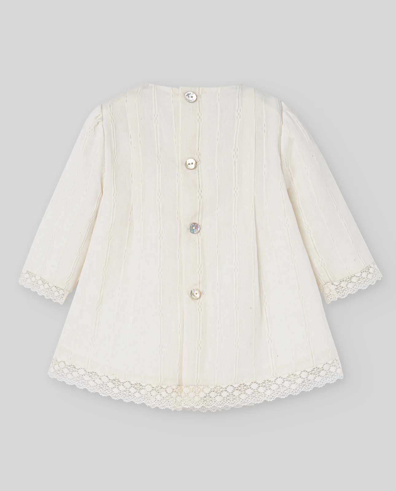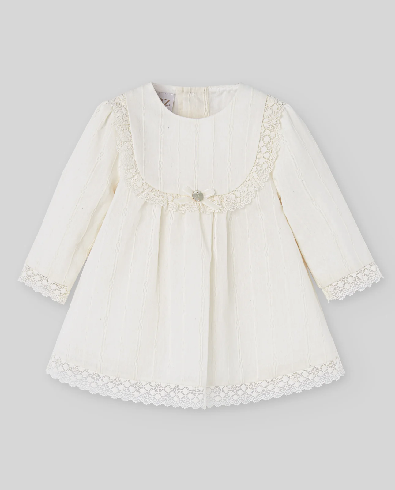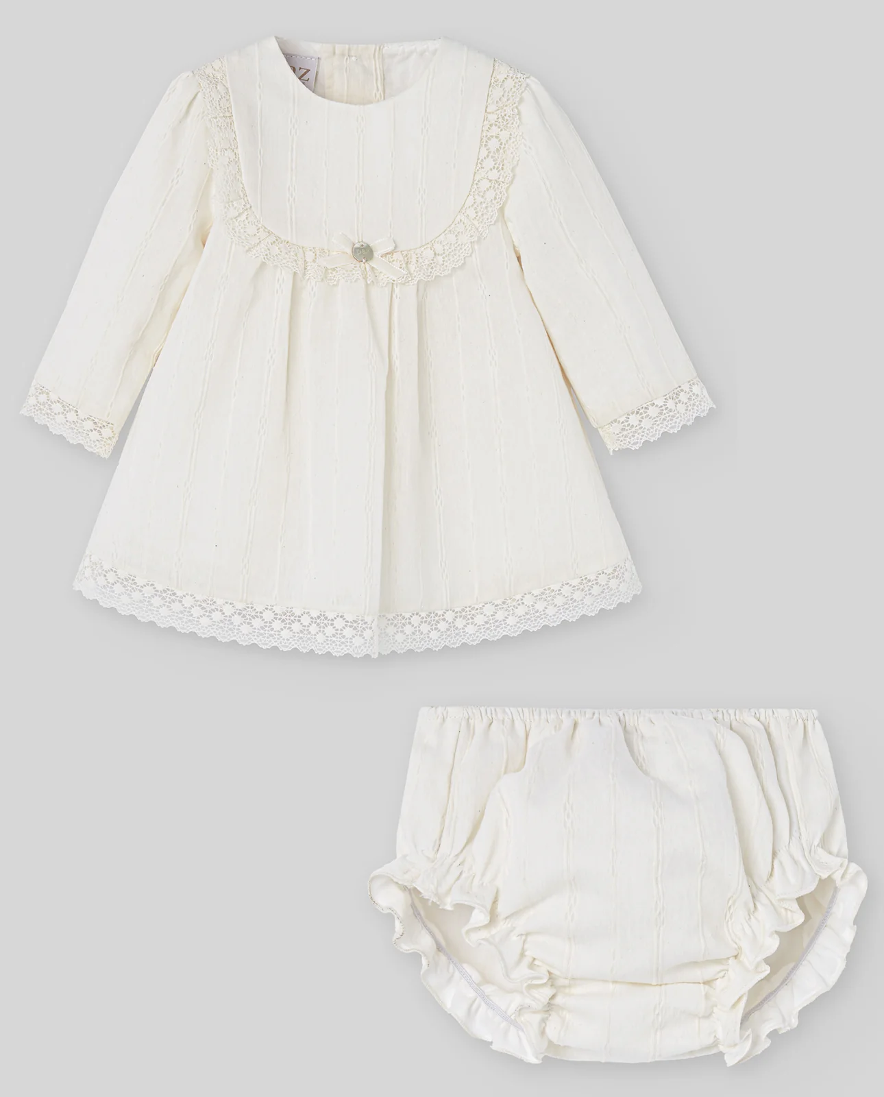 👗 Confeccionado en un suave tejido color marfil con textura bordada y puntilla de encaje en mangas, bajo y canesú, este vestido es puro encanto. Lleva un detalle de lazo con botón nacarado en el centro y una braguita a juego que completa el look. Elegante, dulce y atemporal, es ideal para bautizos, eventos, sesiones de fotos o cualquier ocasión especial de tu peque este invierno.