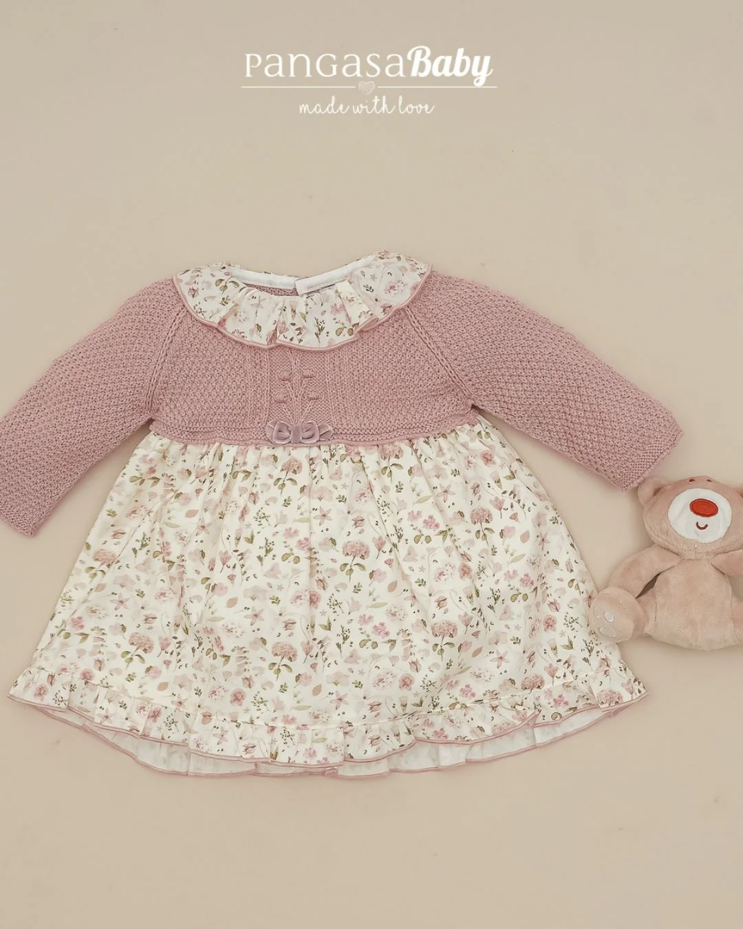 Descubre la dulzura atemporal del vestido de bebé Velvet Pink de la colección otoño invierno de Pangasa Baby. Su diseño combina un cuerpo de punto en rosa empolvado con un delicado estampado floral en tonos suaves, ideal para los meses más fresquitos. Detalles como el volante en el cuello y el lazo a juego lo convierten en una prenda única, perfecta para ocasiones especiales.