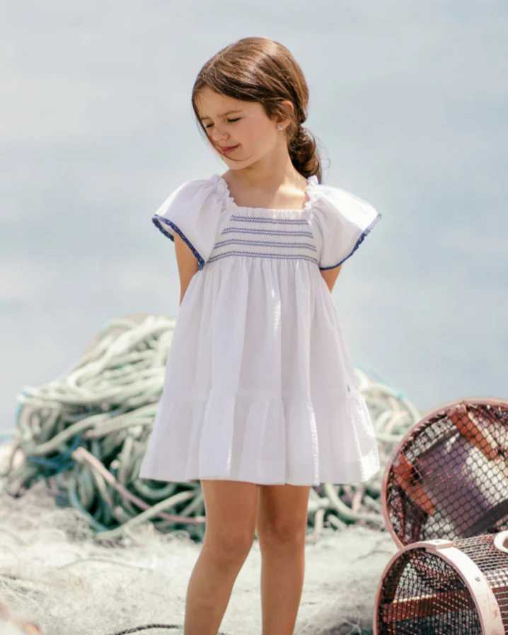 🌊 Vestido infantil blanco Rías de Paz Rodríguez, confeccionado en 100% algodón suave y fresco, ideal para los días soleados de primavera y verano. Su diseño sencillo y elegante destaca por las mangas de volante, el bordado azul marino en el pecho y detalles en las mangas que aportan un aire marinero encantador.