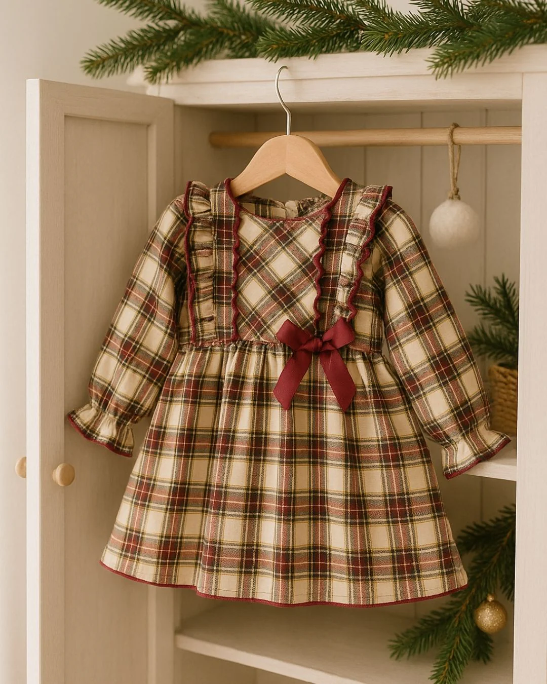 Este vestido para bebé niña es una auténtica joya para celebrar las fiestas ✨ Confeccionado en un cálido tejido de cuadros escoceses en tonos burdeos, crema y verde, y decorado con un precioso lazo granate y volantes con ribete, es perfecto para las fechas más especiales del año 🎁