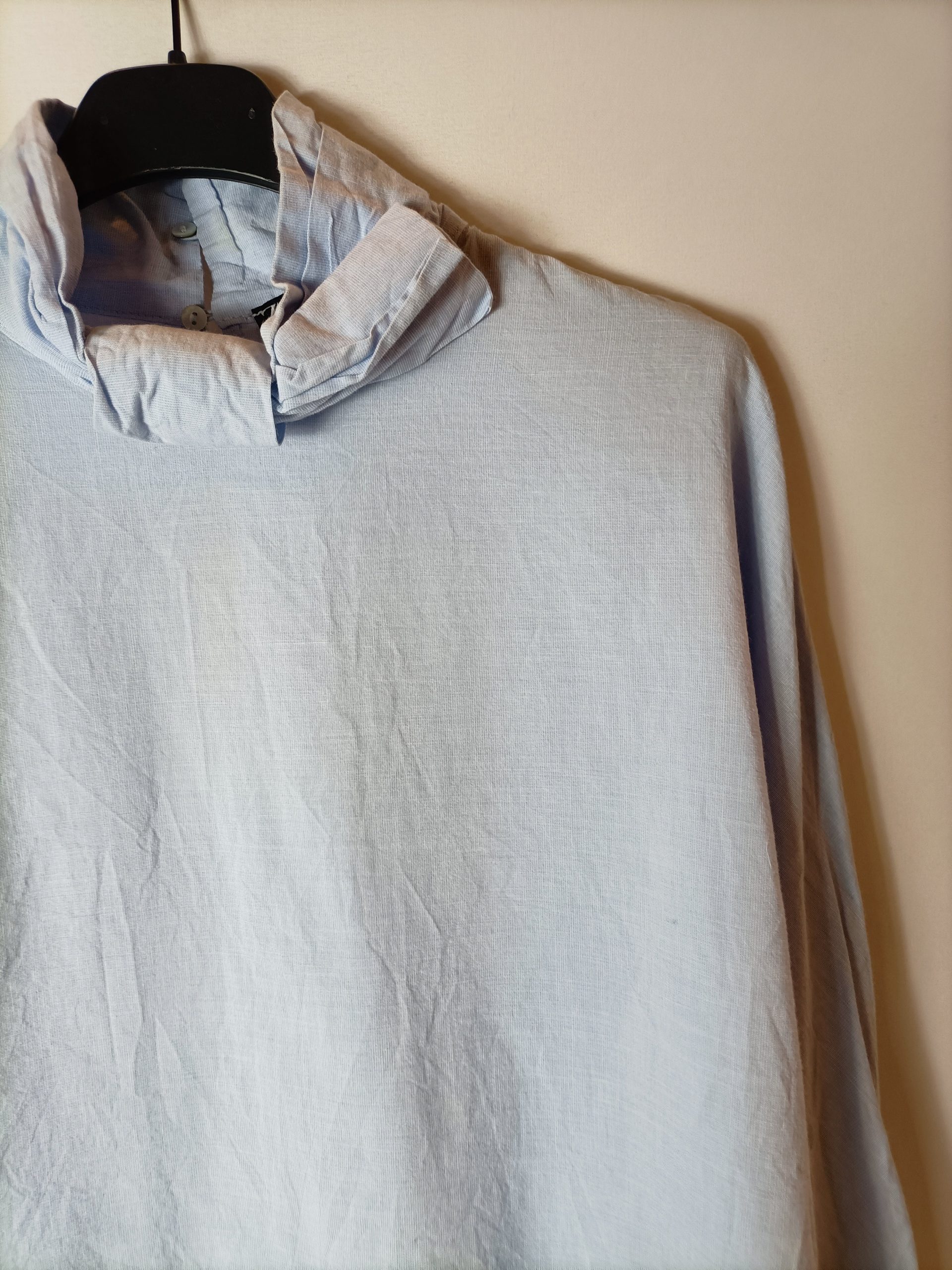 Blusa azul con el cuello perkins y las mangas estilo murciélago