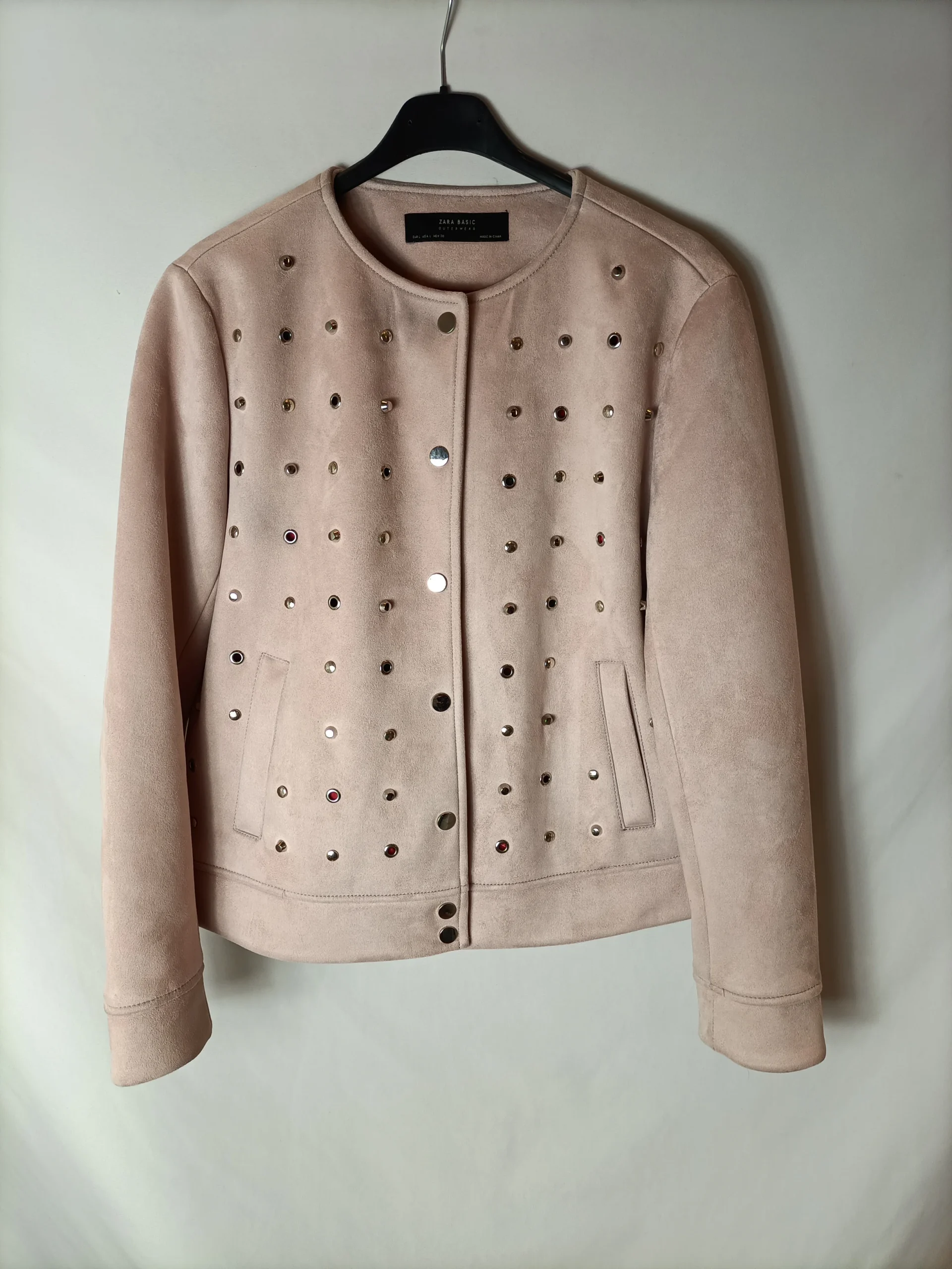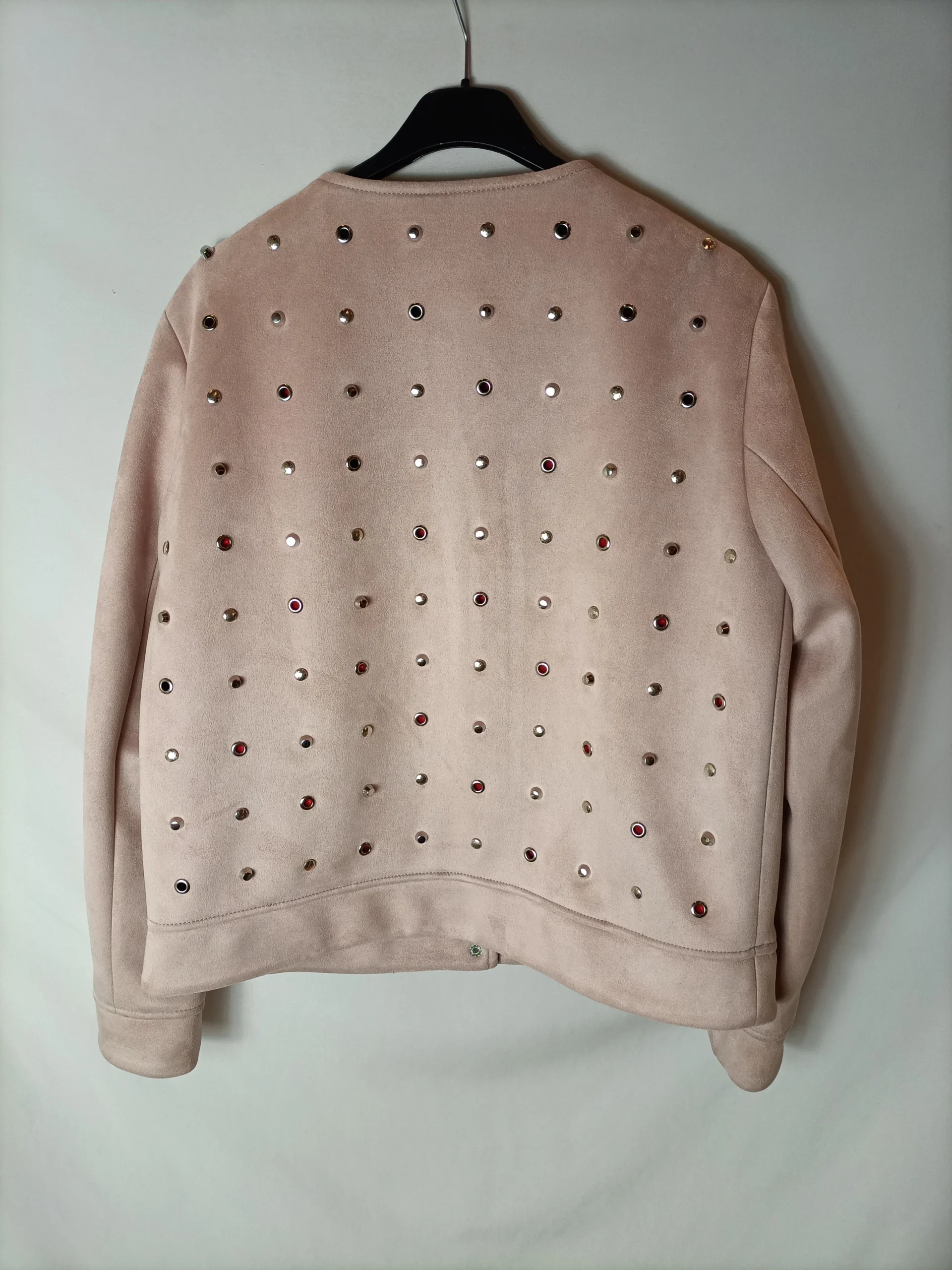 chaqueta rosa de antelina con tachuelas y argollas. de sisa a sisa 52 cm