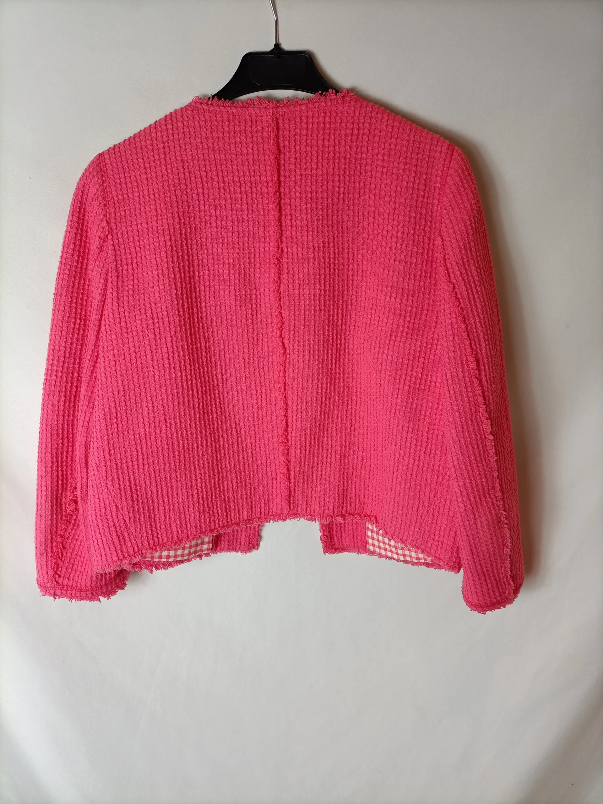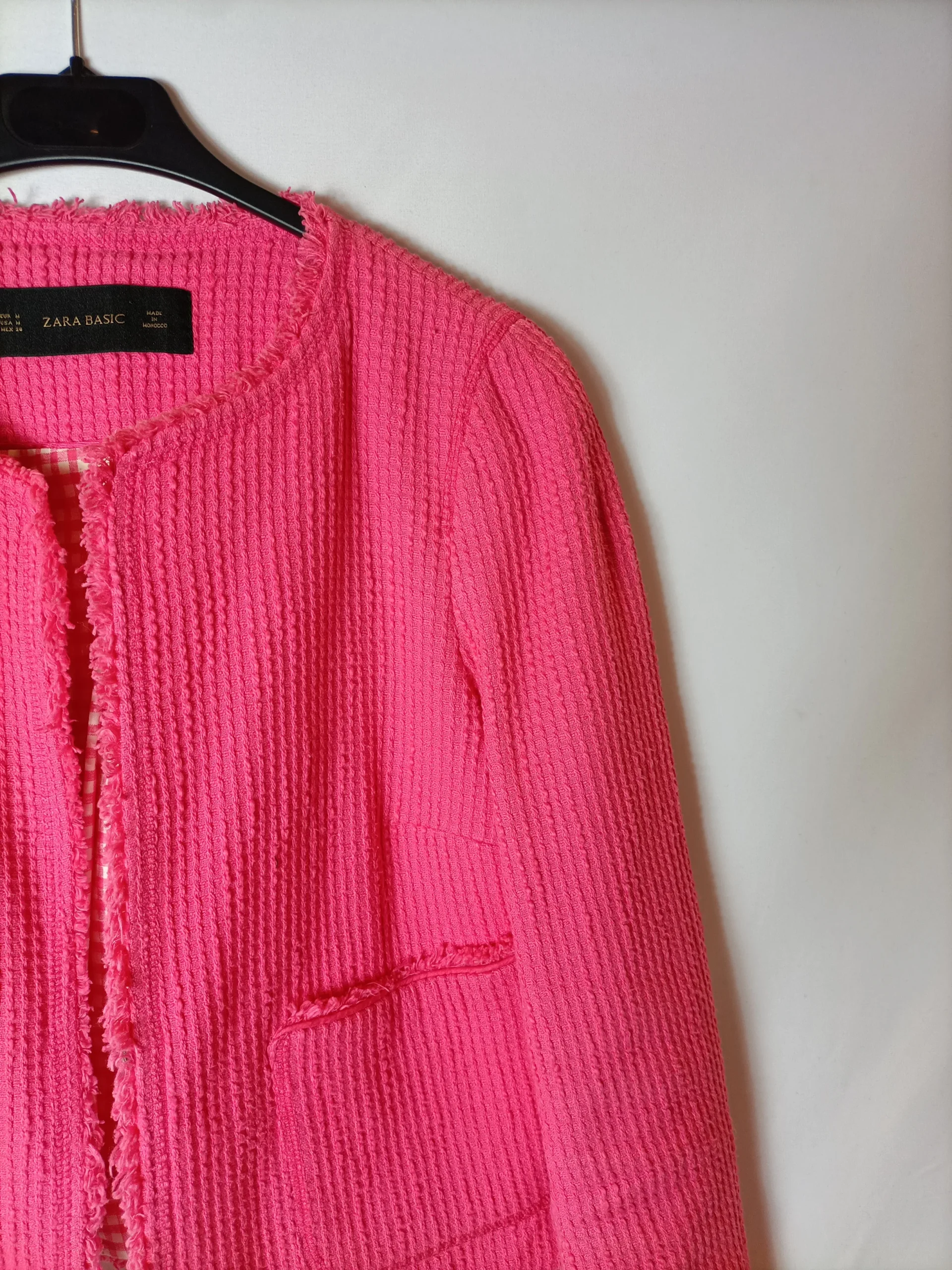 Chaqueta textura rosa con flequitos e interior en cuadros vichy.