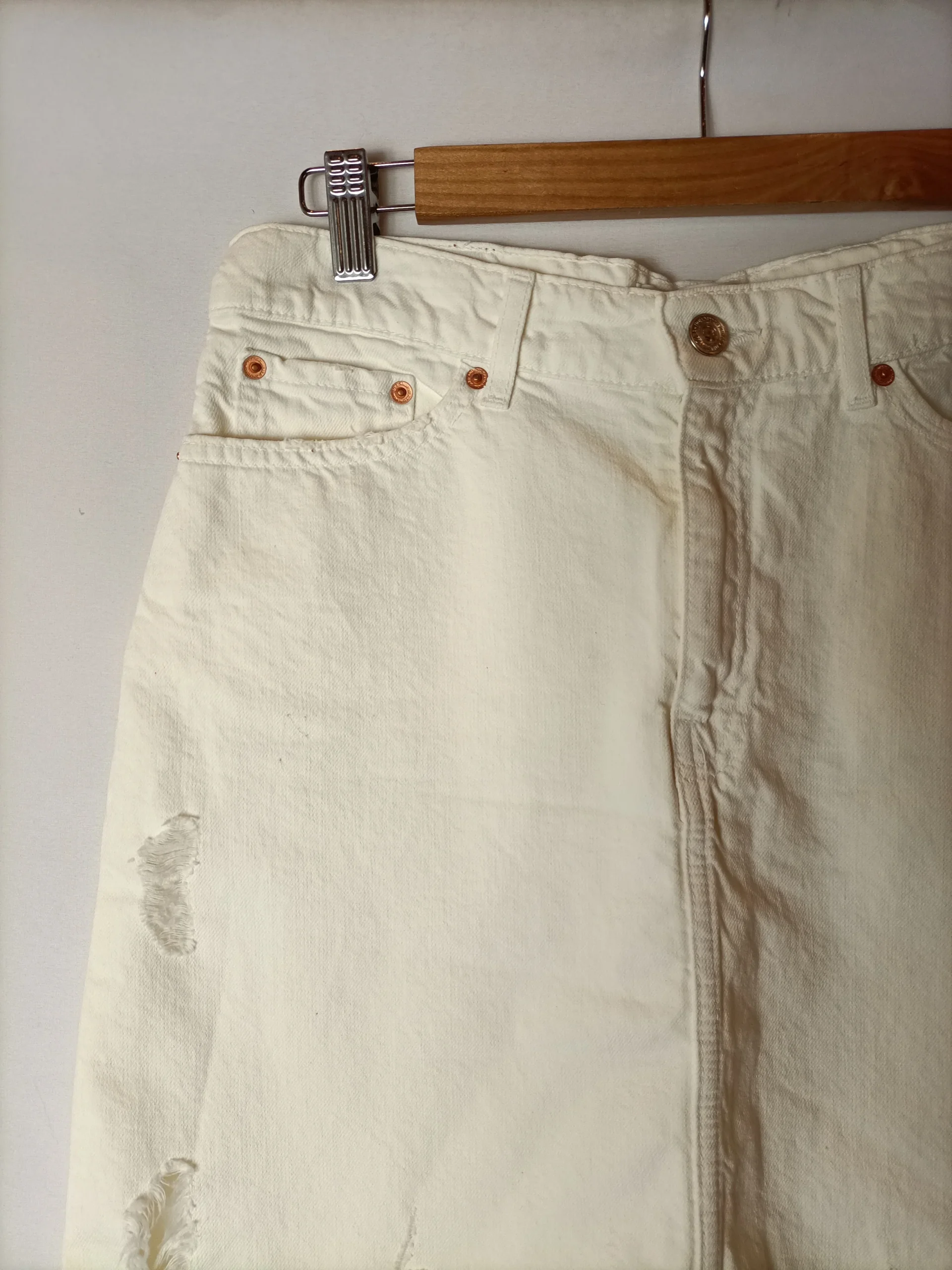 Falda denim beige crudo con rotos y deshilachados. Cintura 40 cm largo 48 cm