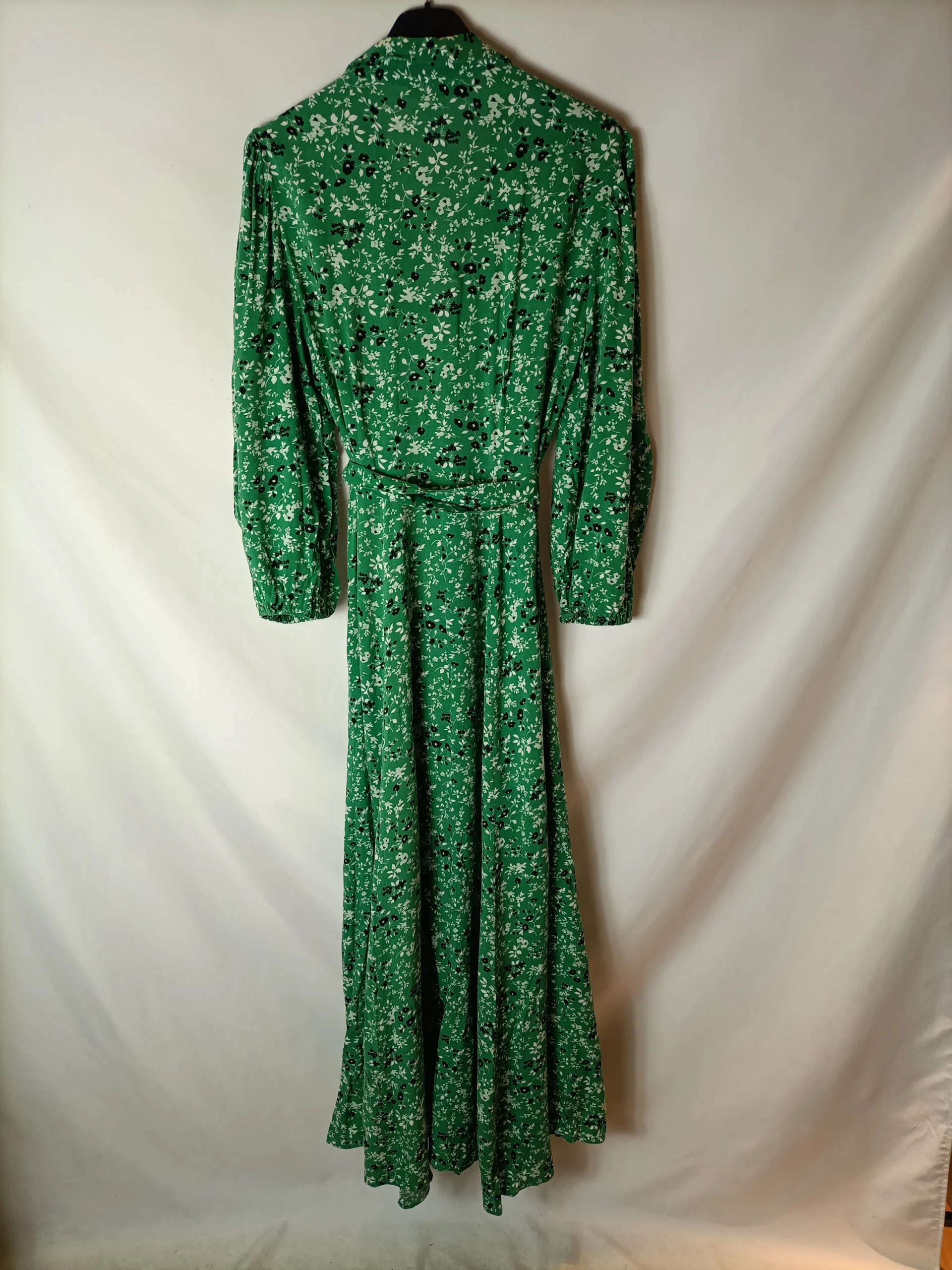 Vestido largo camisero verde con flores. Abotonado. Con cinturón de lazada. De sisa a sisa 42 cm